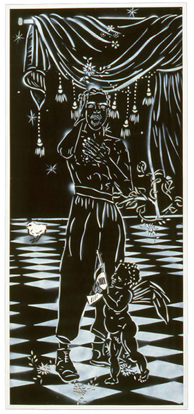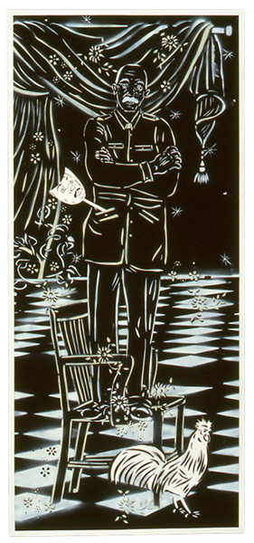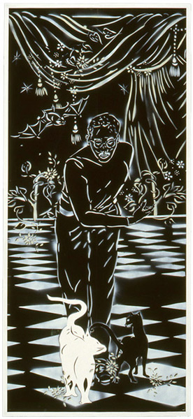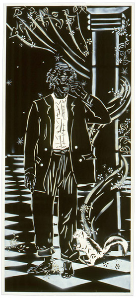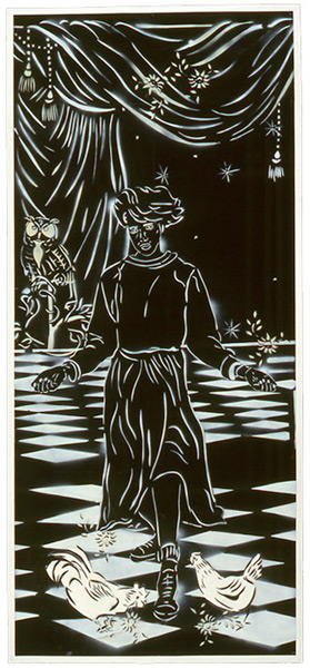 white archetypes. He paints owls, lilies, black putti, white chickens, black and white
