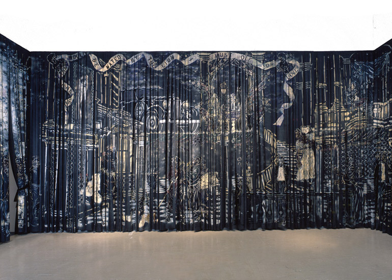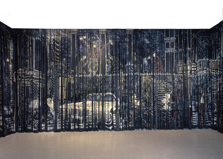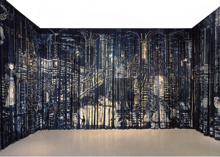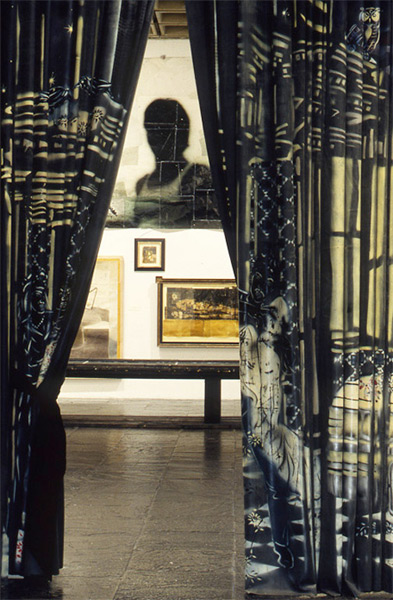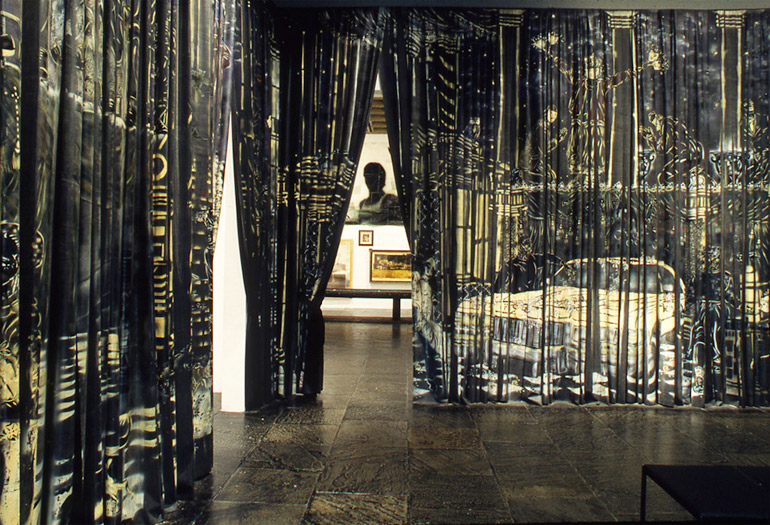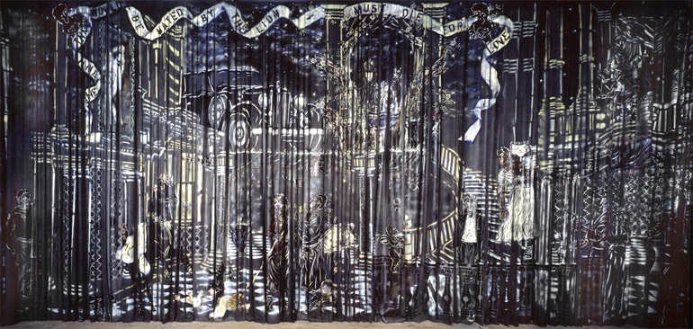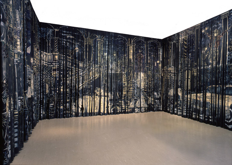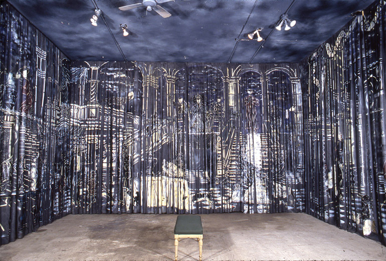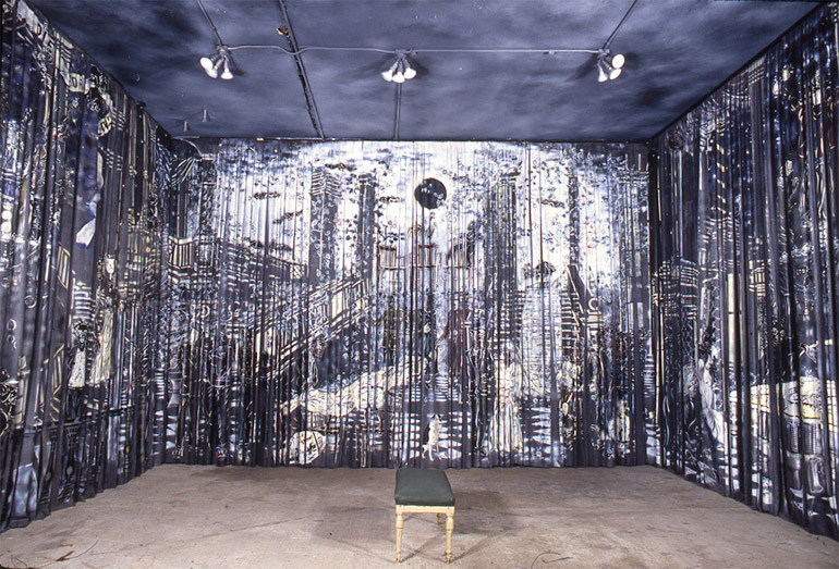 A grand scale room of painted black rubber curtains based on Jean Genet’s play: The Blacks: A clown show. (catalog) |