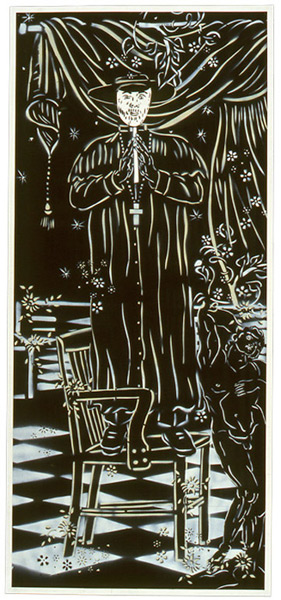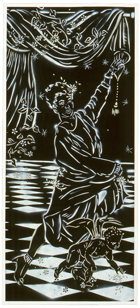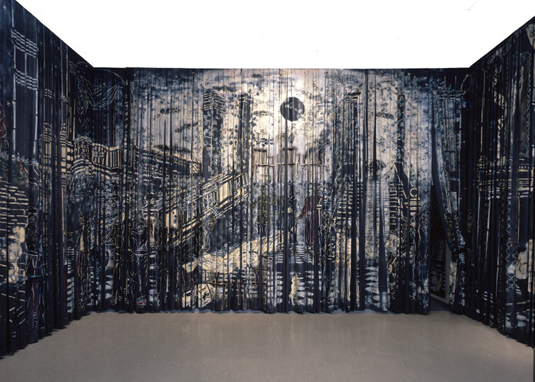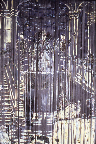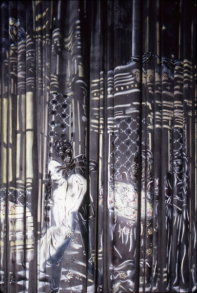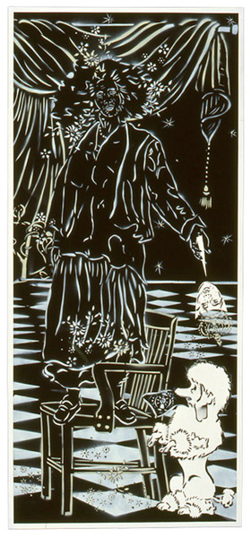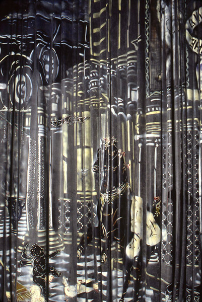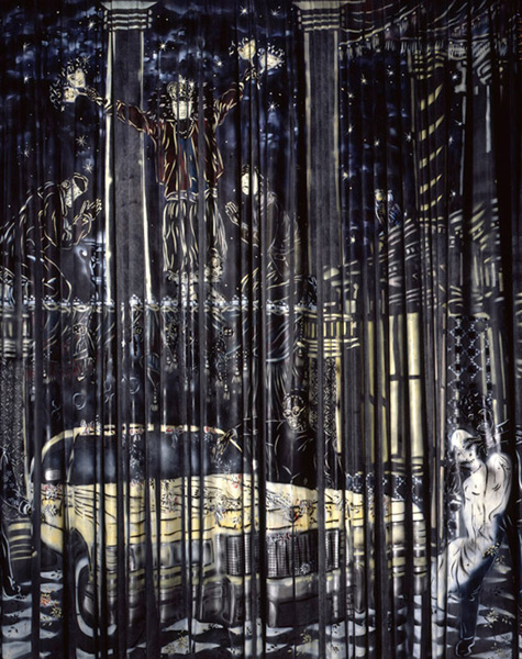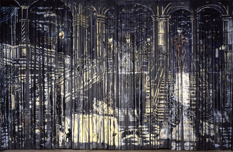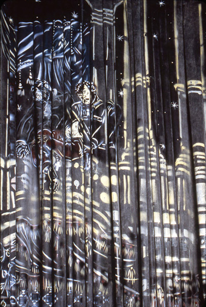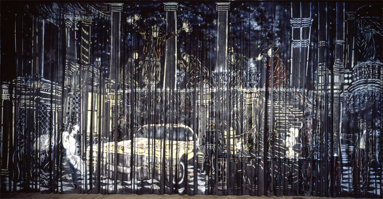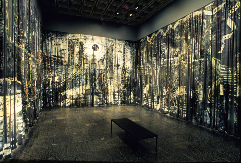A grand scale room of painted black rubber curtains based on Jean Genet’s play: The Blacks: A clown show. (catalog) |