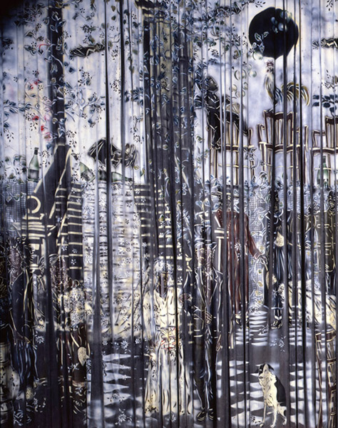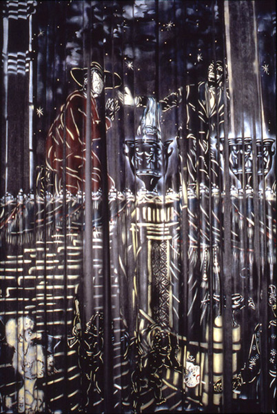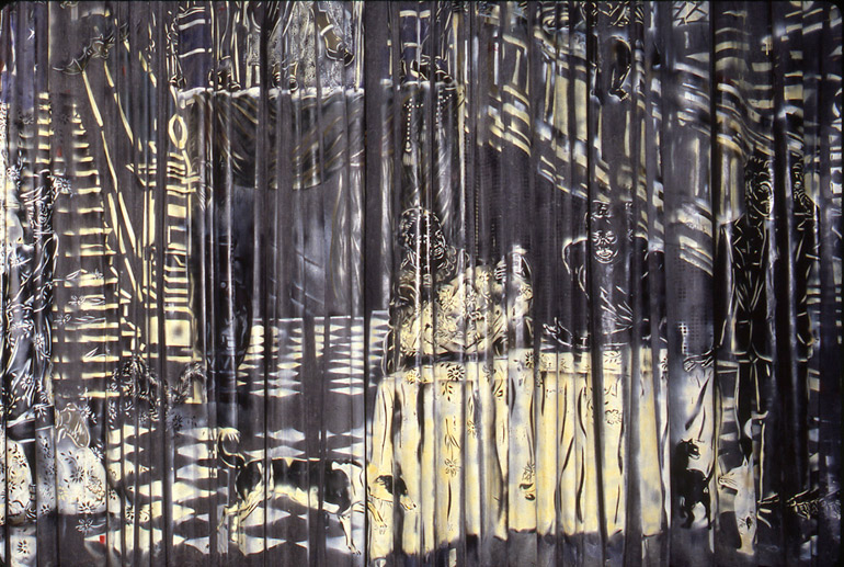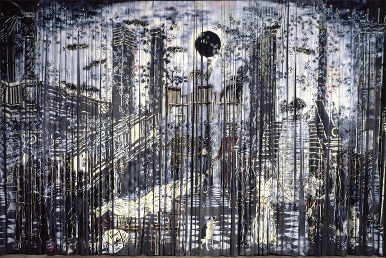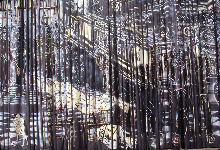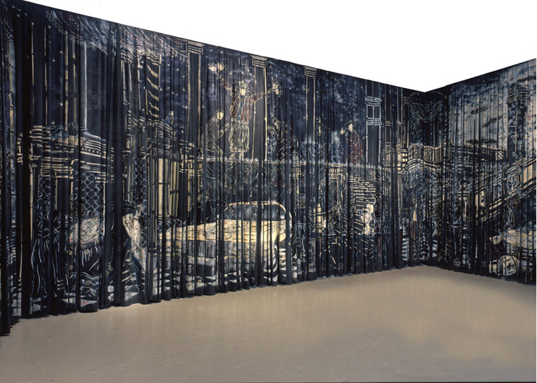 “The grandest experiment is Izhar Patkin’s room-size “The Black Paintings,” painted in white ink on black rubber curtains. Its myriad figures includes Manet’s “Olympia,” who reigns over a court of magical and demonic creatures. In its own way, it is late 20th century Sistine Chapel, absorbing and provocative.”
