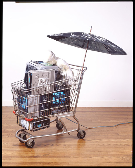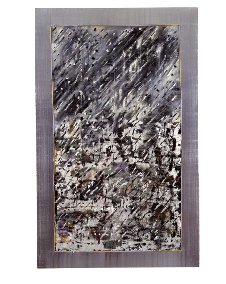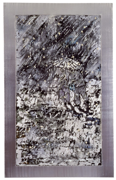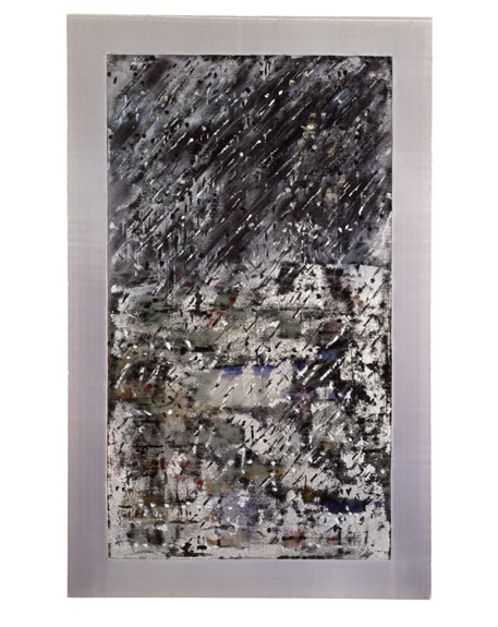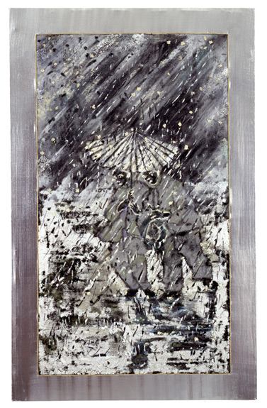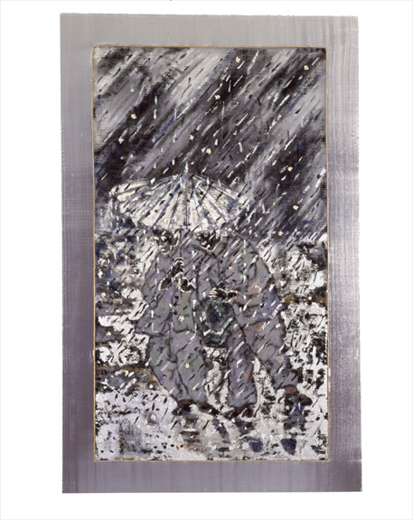 A panoramic sequence of five paintings that depict a progression of scale. In each successive painting, two figures in the rain appear to be approaching the viewer.