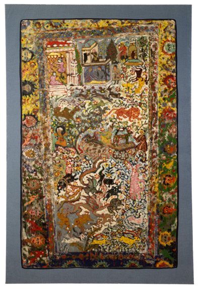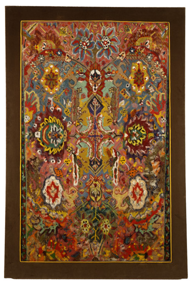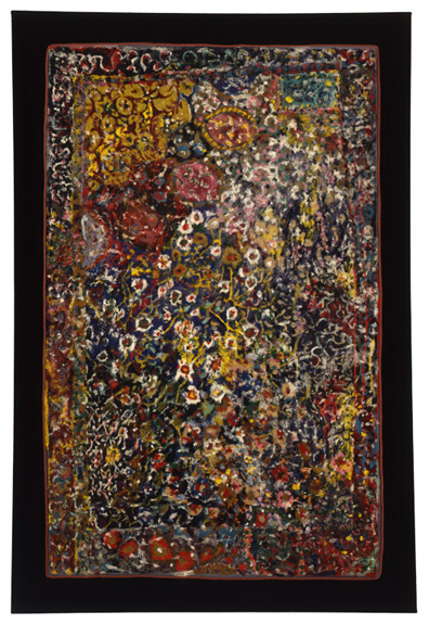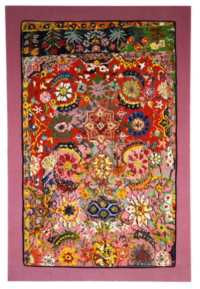 The exhibition of Host Culture (a group of "rug" paintings within the Gardens series) at the Tel Aviv Museum of Art opens another important window into Patkin’s oeuvre. Merely by being exhibited in Patkin’s homeland, it initiates a unique dialogue with his origins and sources of inspiration as an artist. The carpets create a multicultural encounter that builds a bridge between East and West, Islam and Judaism, craft and art, tradition and avant-garde. In Israeli culture, the encounter that takes place in these carpets is translated into the richness of the social tapestry formed by the variety of immigrant groups that came here. Patkin infuses the global notion of multiculturalism with a regional Levantine metaphor: the myth of the sanctity of hospitality -- the culture of hosting and of being hosted.