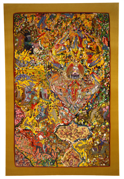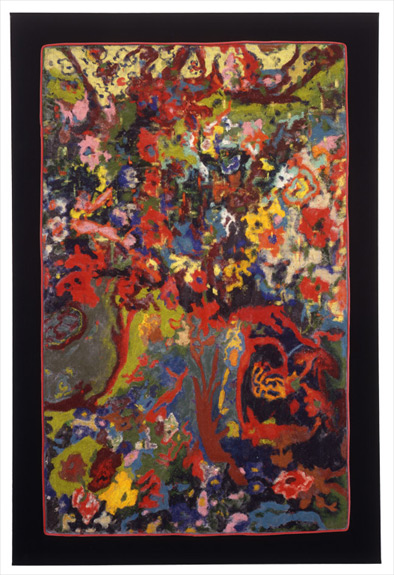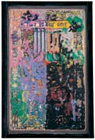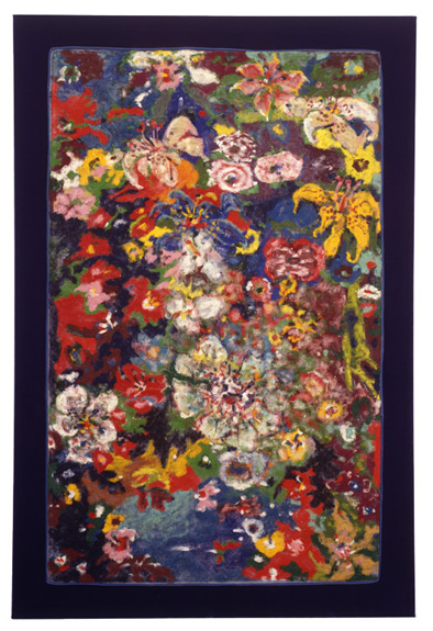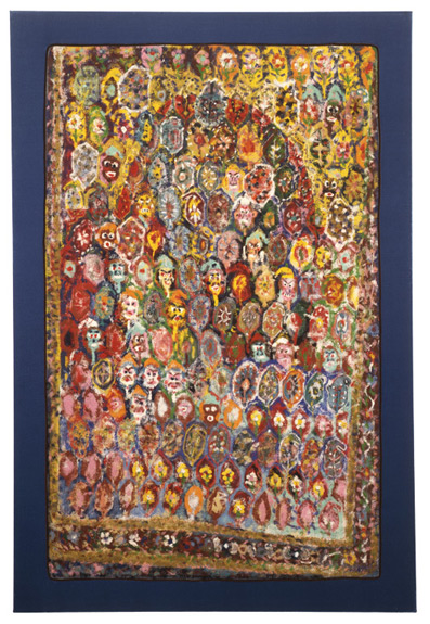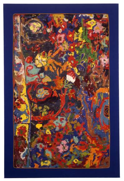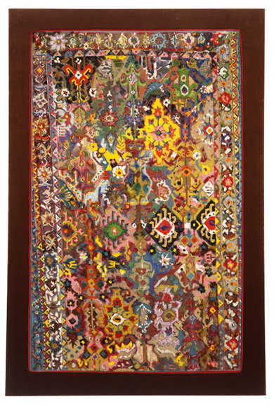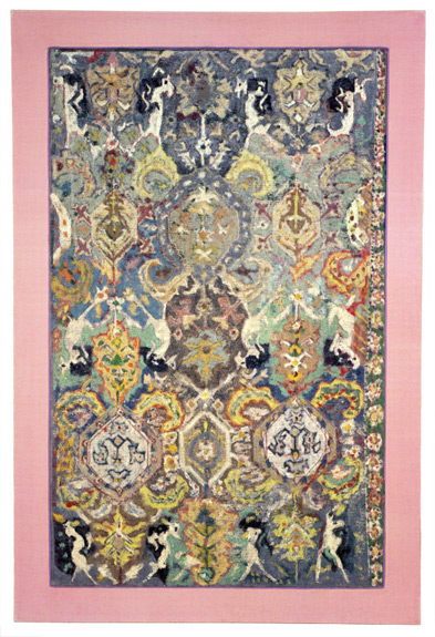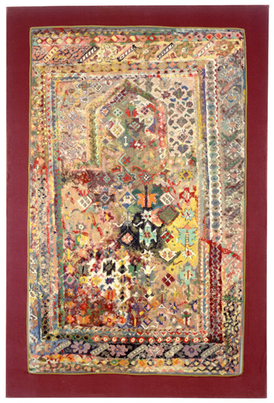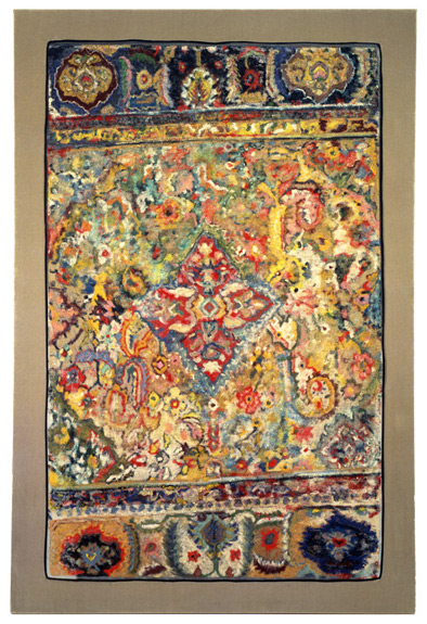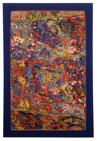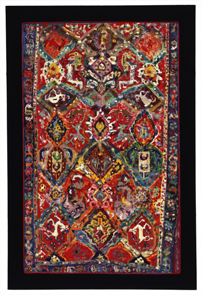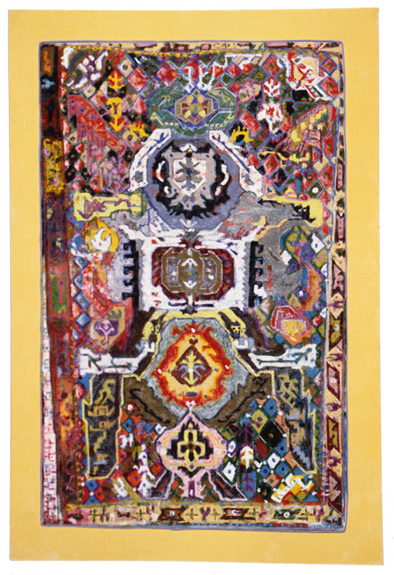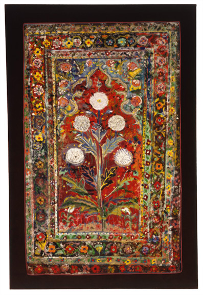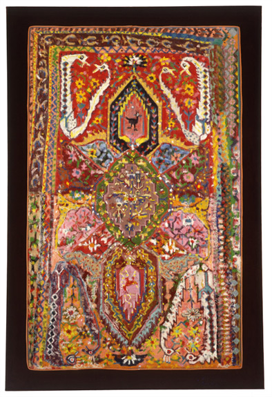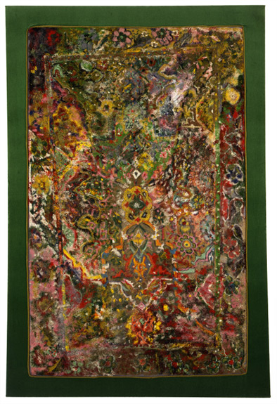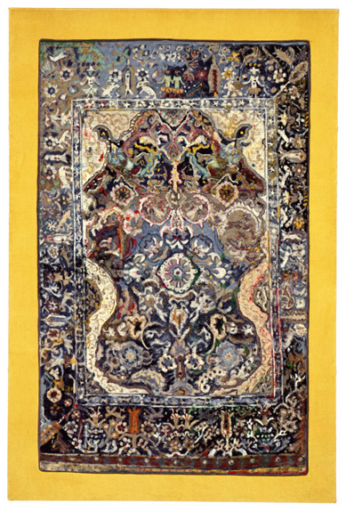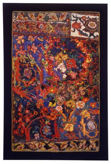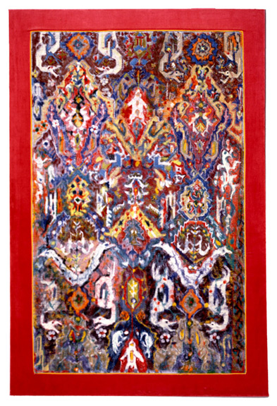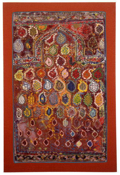 Izhar Patkin's interest in ethnic and cultural pluralism led him in the early 1990s to create a series of over 100 paintings based on Oriental and Persian rugs and entitled Gardens for the Global City. In these paintings, Patkin put to use an inventive painterly process that had as much to do with crafts as with Art. The works were painted using the "reverse painting" method, originally a folk art technique of painting on the back of a sheet of glass. In Patkin's paintings, oil paint mixed with wax is pushed through the underside of a stretched aluminum wire mesh to the front, creating a surface that recalls the texture of a carpet. When the paint fills in the vacant mesh, the "canvas" is created. The entire object thus becomes a trompe l'oeil. With his unique painting technique, Patkin enhanced the presence of the touch of the hand and underscored the physical activity of painting as essential to the joy of creation.