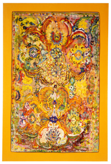 Many of the works in Patkin's series have been acquired by influential international museums such as the Whitney and the Guggenheim in New York. In the context of these collections, Gardens for the Global City open a window that draws the Western viewer into the repetitive rhythms of the arabesques and vibrant colors of the Oriental rug. The charm of the patterns evoke tranquility or agitation by turns, but the eye roves and eventually gives in to the intoxicating seductiveness of the paintings. The composition of the Oriental rug gives way to questions about contemporary painting, and vice versa.