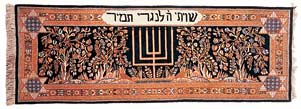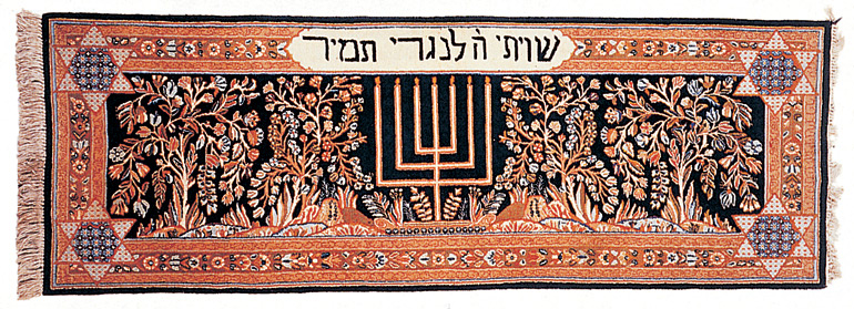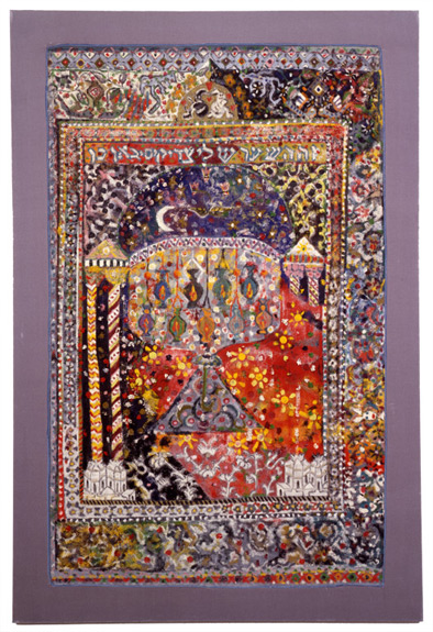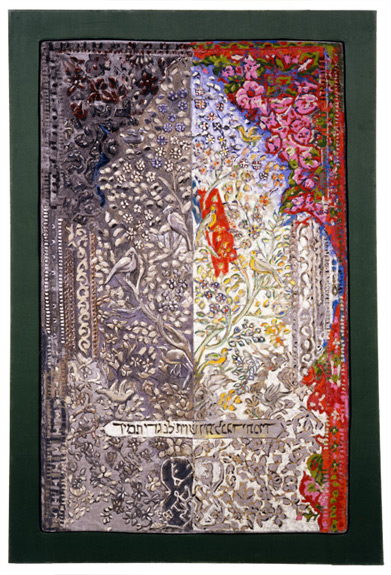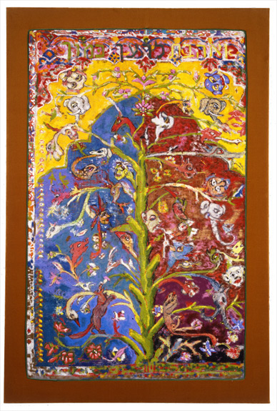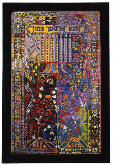 Ve-ahavta contains a written fragment from the Biblical expression that appears in the rug on which the painting is based: "thy neighbor [as] thyself." Patkin repeats the text in mirror-writing at the top of his piece. At the bottom, as in the original carpet, there is a six-branched Menorah. The principle of symmetry helps Patkin to engage cultural affinities: the candelabra, symmetrical by definition and standing on a tall pedestal as it did in the Temple, is part of Jewish iconography and the same time alludes to the symmetry of the tree of life composition typical to the Persian carpet.