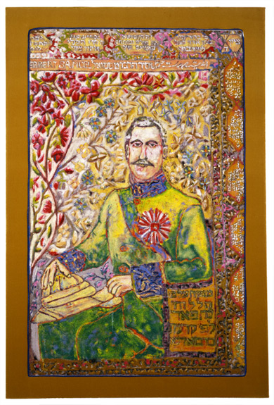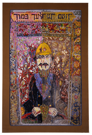 The image that appears in Aroch's The High Commissioner (1966) was painted after a tapestry portrait of Sir Herbert Samuel, commissioned in his honor by Zionist Jews from Iraq. (At the bottom of the tapestry is the inscription, "Zionism of Iraq," in Hebrew.) In 1920 the British mandatory government appointed Sir Herbert Louis Samuel (1870-1963) to the post of first High Commissioner in Palestine. As the first Jewish governor in Jerusalem since the days of the Second Temple, Samuel was received in the country as a harbinger of redemption. Despite the high hopes that were pinned on him, Samuel disappointed both the Jews and the Arabs during his term (1920-25) as high commissioner .