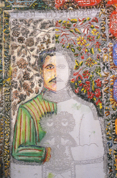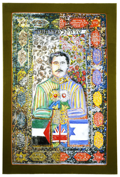 In Eshkach smali, it is the left side of Samuel’s image that is missing and the right side that is repeated. The hands are facing outward and the Biblical verse at the top is broken, like the mirror image in the center of the composition of Ve-ahavta. In between Eshkach yemini and Eshkach smali is Reu shalem, in which Samuel’s portrait appears in a normal manner. (Reu shalem means see whole in Hebrew). He is depicted as a colonial master against an Oriental background which adds that "certain atmosphere" of cultural and political weight. The reference in the title Reu shalem is to Jerusalem, a city that is holy to three religions. The painting is based on a 1921 rug in which a rectangle to the right of the high commissioner bears an inscription (p.15); Patkin lavishes attention on this text, which bears the name of the weaver and an ode to him: Hillel Chai Shetefaer... praise and embellish life. 'Hillel' (praise) and 'Chai' (life) being literally the name of the weaver. In each corner of the rug is a Star of David with the Hebrew word Zion in its center; on each of the small triangles composing the six-pointed star is a Hebrew letter; read together, they spell out the words Magen David [star, literally shield, of David]. Biblical quotations inside twenty small frames around the edge of the rug identify the high commissioners appointment with the messianic expectations that some parts of the Jewish community held with respect to the first Jewish governor of Jerusalem after 2,000 years of exile - In contrast to the weaver's name, Patkin renders these texts illegible, practically gibberish.