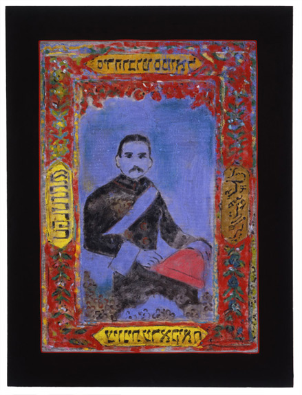 The second group consists of four figurative paintings: Homage to Aroch, the smallest in the series, is based almost directly on the Iraqi Jewish rug from 1928 (p.40). In this painting, Patkin takes on the principle of mirror image by painting the rug from the back of the screen, and purposefully not correcting the right-to-left reversal. The result is that the texts are backwards, as is the image of Herbert Samuel. The connection to the mirror image of Samuel in Aroch’s The High Commissioner is that it is displayed here as if Aroch himself had viewed the rug in a mirror.