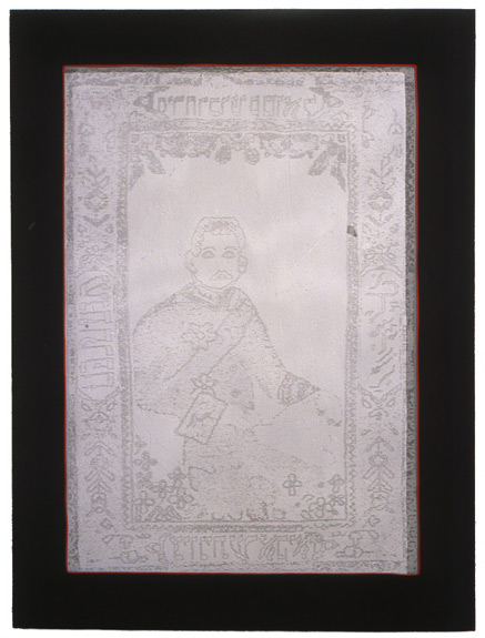 Instead of reproducing the image of the commissioner twice, as in a mirror and its reverse as Aroch did, Patkin bisects the image lengthwise (along Samuel’s spine, as it were) and duplicates one half of the image twice -- thus making one figure with two left sides and one with two rights. In contrast to the ideal figure of perfect classical symmetry, the symmetry of Patkin appears provocative and repellent, even monstrous. Patkin’s split figures evoke a dynamic of internal conflict rather than the pleasant dynamic rhythms and patterns of the Oriental rug.