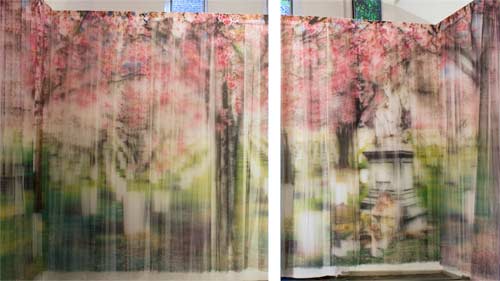 Veiled Threats1999-current a series inspired by the poems of Agha Shahid Ali Rooms of wall size paintings in ink on pleated illusion (tulle curtains), 14 x 22 x 28 each