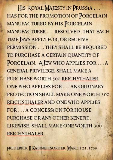 במחקרו הוא מצא בכתובים צו קבינט מתאריך 21 במארס 1769 שהוציא הוד מעלתו מלך פרוסיה, המלך פרידריך השני, ובו הוראה שבכל פעם שיהודים מגישים בקשה לקבלת רשיון זה או אחר, או זוכים להיתר כלשהו, לא חשוב באיזה נושא, הם ידרשו לרכוש כמות מסוימת של כלי חרסינה. כל זאת מתוך רצון המלך לקדם את תעשיית החרסינה מתוצרת בית החרושת המלכותי.