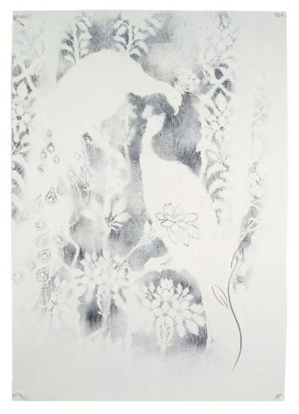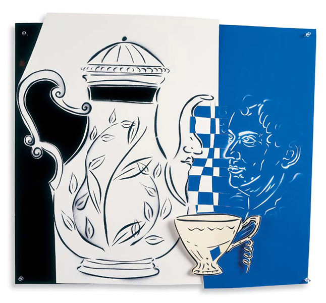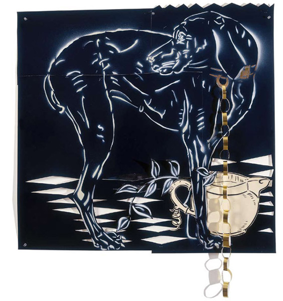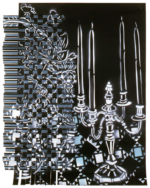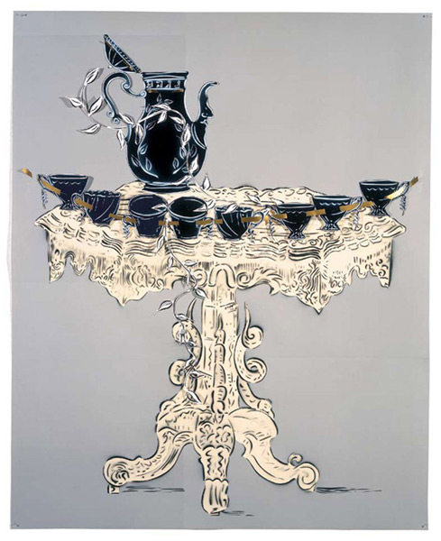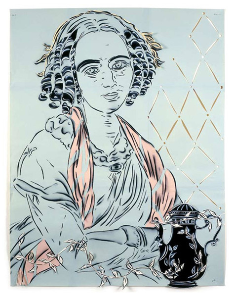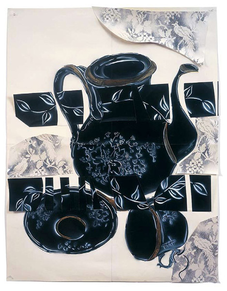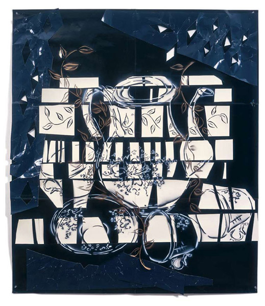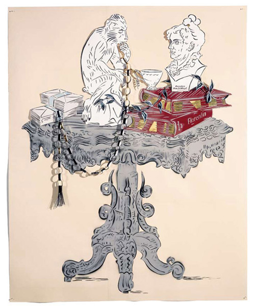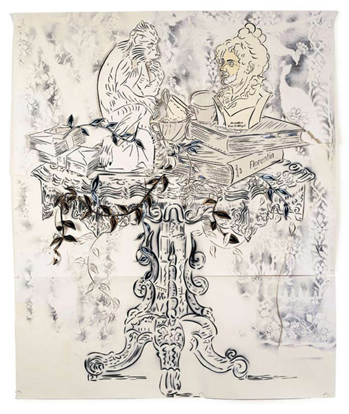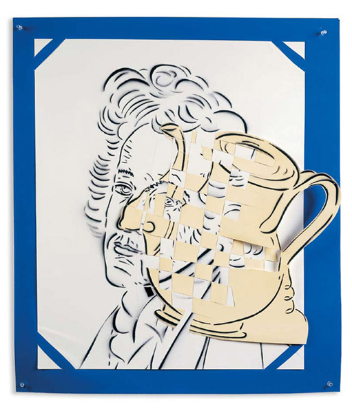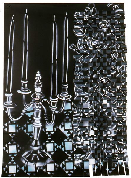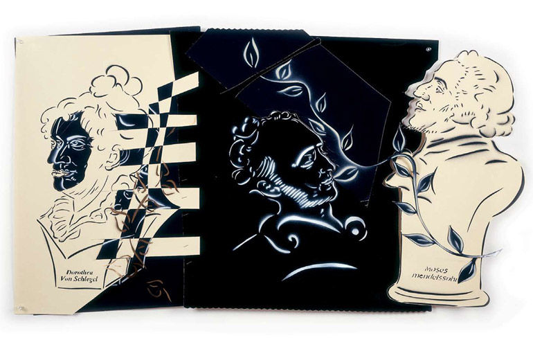 Large-scale collages in a technique that involves cutting, folding and weaving stenciled paper. “Judenporzellan” is based on the story of an 18th century law, which forced Berlin’s Jewry, the Mendelssohn family among them, to buy inferior and overpriced porcelain from the king’s failing factory. (catalog)