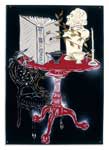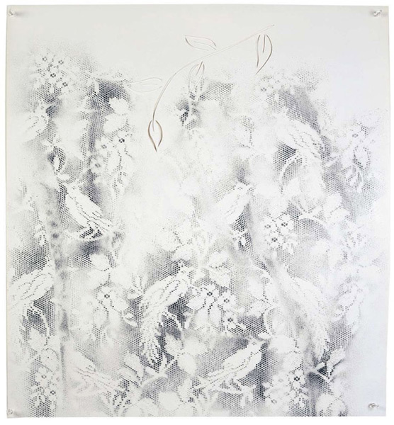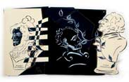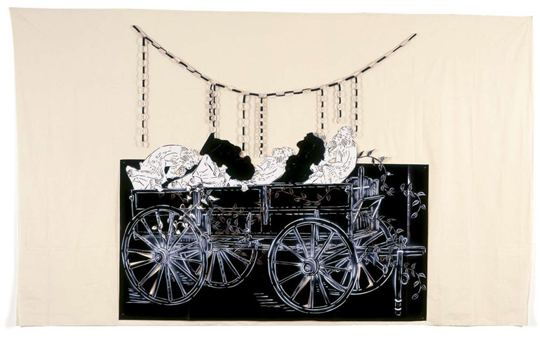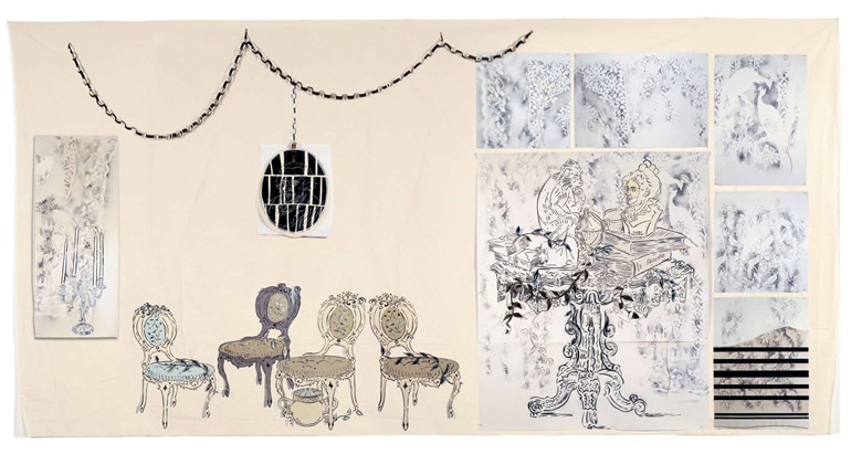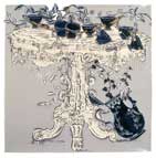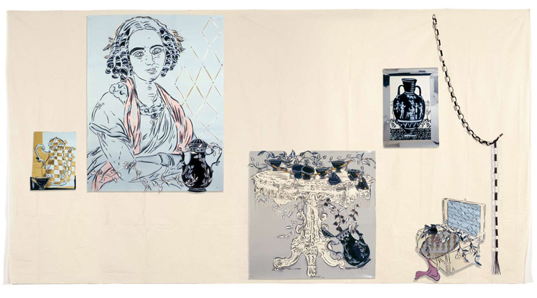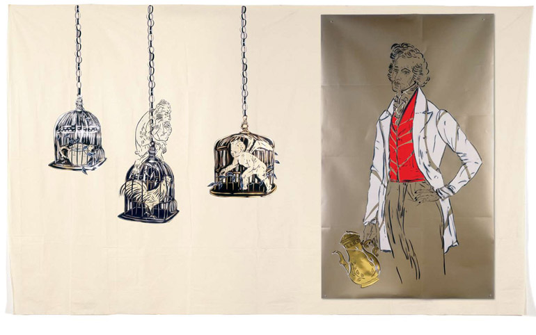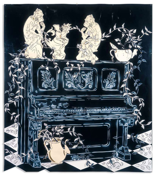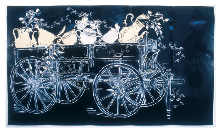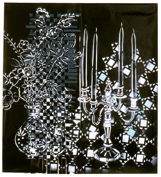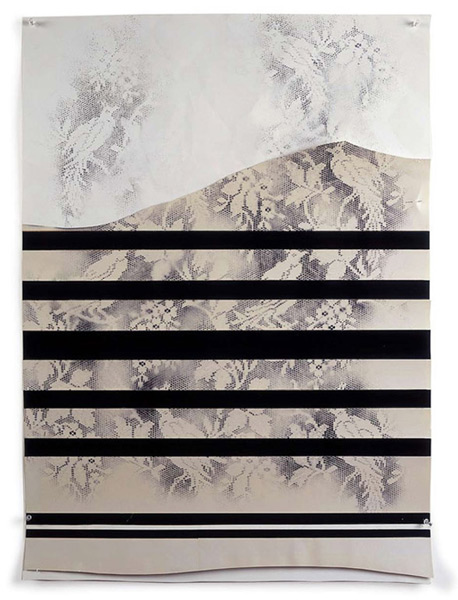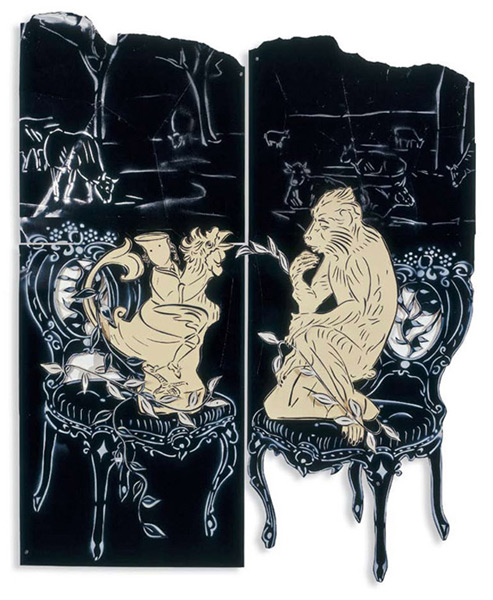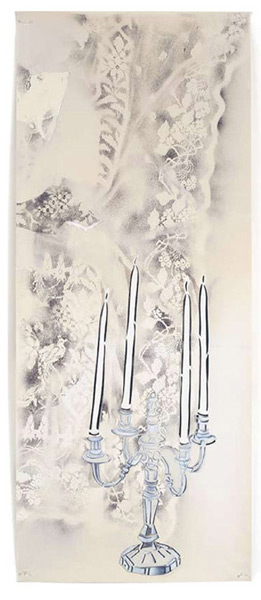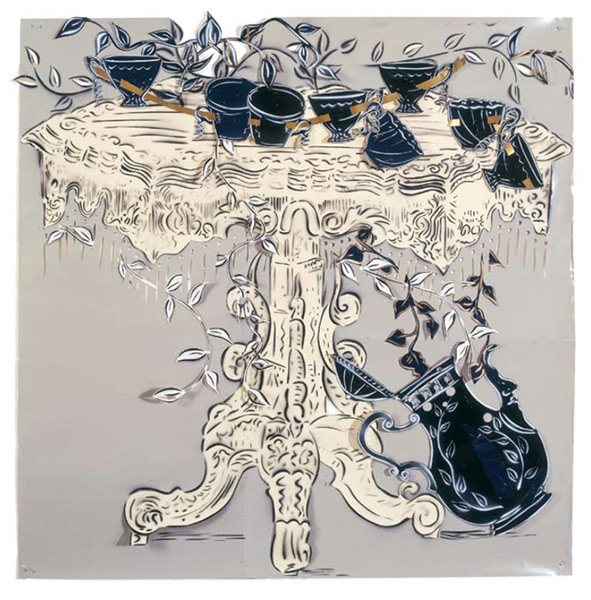 Large-scale collages in a technique that involves cutting, folding and weaving stenciled paper. “Judenporzellan” is based on the story of an 18th century law, which forced Berlin’s Jewry, the Mendelssohn family among them, to buy inferior and overpriced porcelain from the king’s failing factory. (catalog)