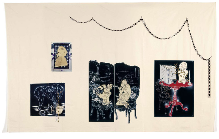 "נכון, אבל היום כבר פתוחים לזה יותר. הרעיון המקובל הוא שבעבודת האמנות צריך להיות מסתורין גדול. אני אומר שכאשר אתה מספר סיפור כמו שצריך, עם עומק ועם תנופה של חדשנות, המסתורין יהיה שם מאליו. הרעיון להדגיש את הנושאים היהודיים והישראליים של השורשים שלי מאוד מעניין אותי ובעצם היה בכל העבודות שלי. אפילו בסדרה 'הציורים השחורים' לפי הטקסט 'השחורים' לז'אן ז'נה תמצאי את הקופידונים ואת התרנגולות שאת רואה היום ב'יודנפורצלן' (הסדרה, וילונות מגומי שחור, הוצגה בביאנלה של הויטני ב-87' ונרכשה על ידי המומה תמורת 200 אלף דולר). המקורות האישיים-פרטיים שלי תמיד קיימים בעבודות. אני רואה את עצמי קודם כל כמייצג את העושר התרבותי של היהודים והישראלים. מכאן שהמניע שלי הוא קודם כל רגשי ואחר כך שכלתני".