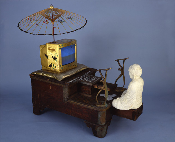 wood, wax, plaster, enamel, gold leaf, fabric, tv monitor, video