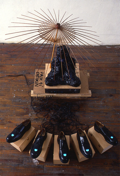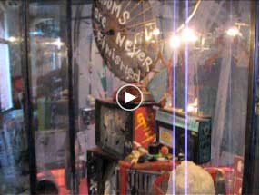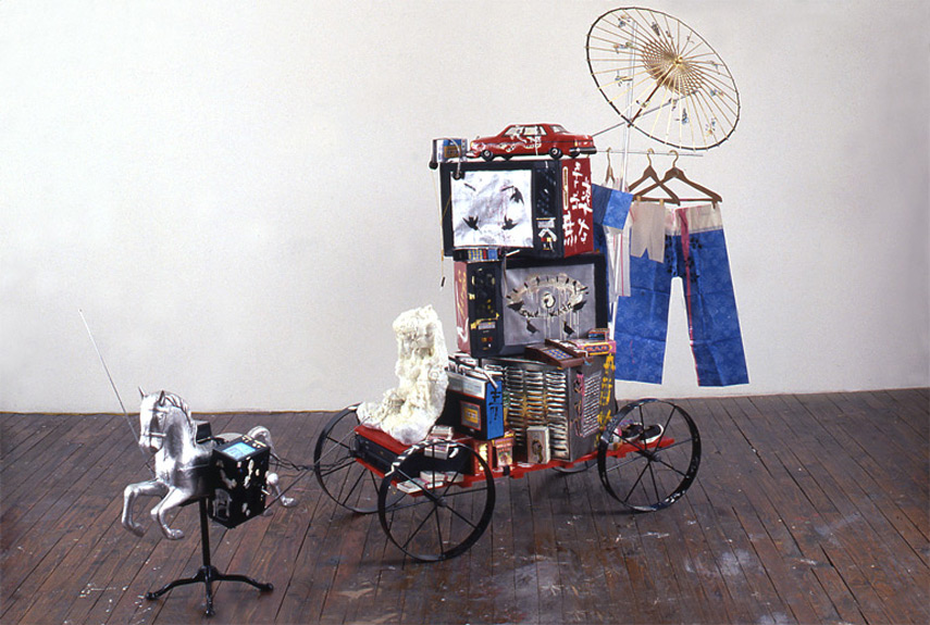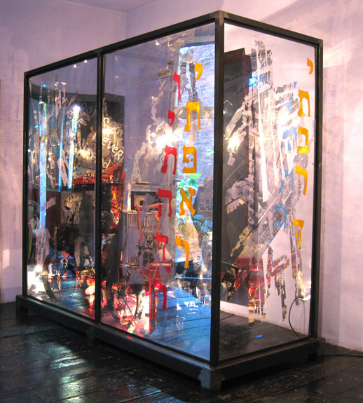 mirrored plexiglass vitrine filled with joss paper sculptures*, steel, enamel, tv monitors, light bulbs, wood, wax, plaster, video
