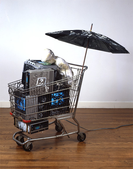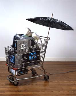 shopping cart, vcr’s, tvs, perforated paper, umbrella, plaster, wax, video