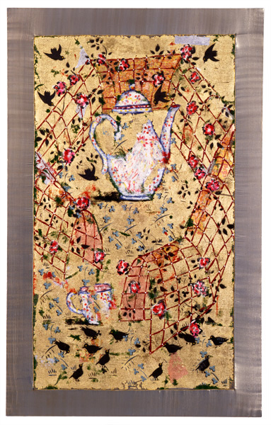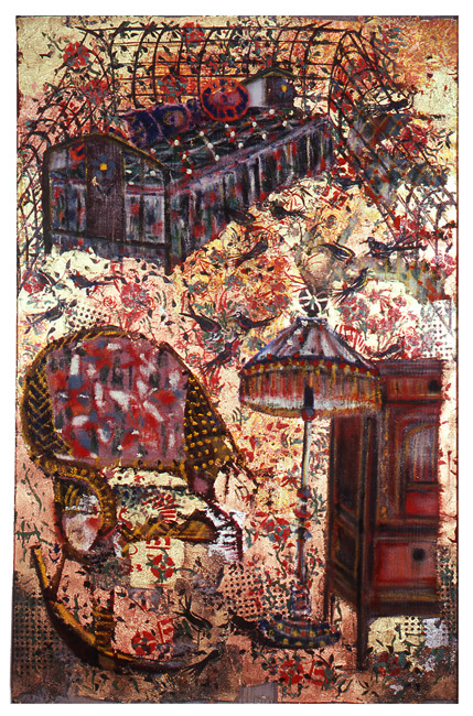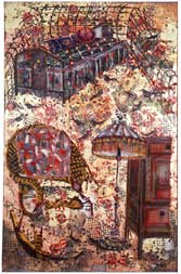 The internal or external dialogue must proceed. I see the painting with the cock and the teapot, Tradition, and start thinking about the language of desire and the codes of psychoanalysis that go with it: a vaginal sacrifice, coitus and birth, or vice-versa; the forbidden . . . . But Patkin does not allow me the pleasures of interpretation. As if fearing reduction he seeks refuge in the fragile exchange of ‘ready-mades’: “the whole world rests on chicken wings,” he tells me, quoting a Hebrew proverb.