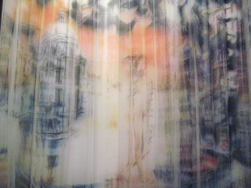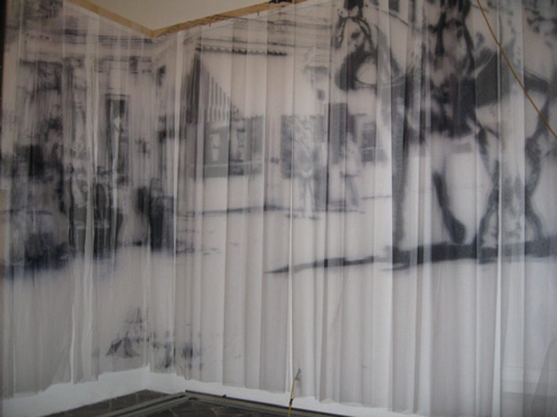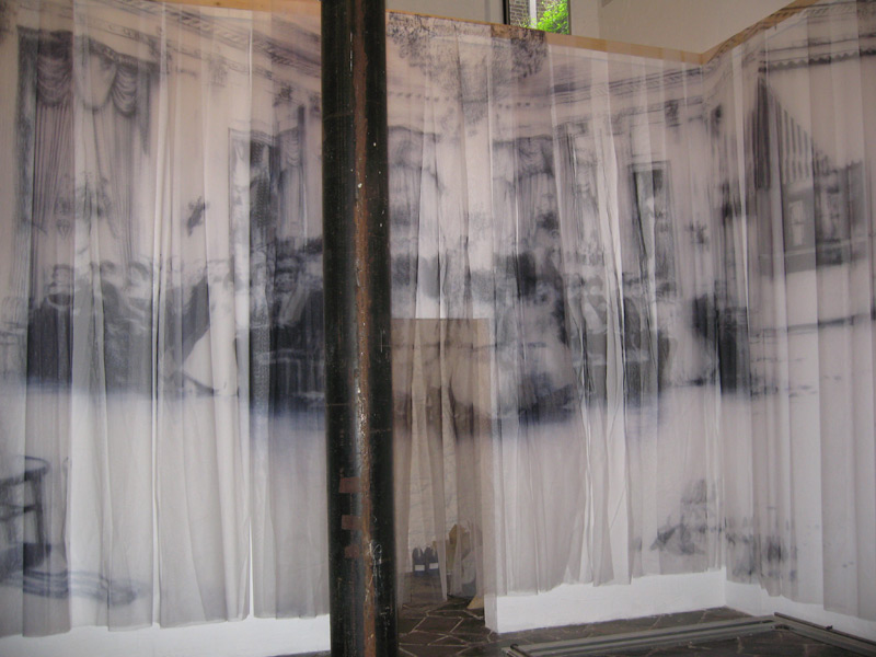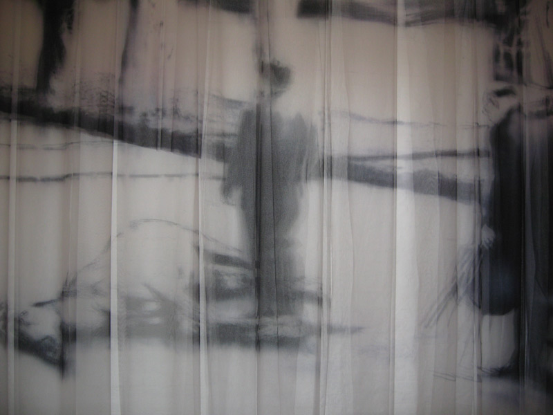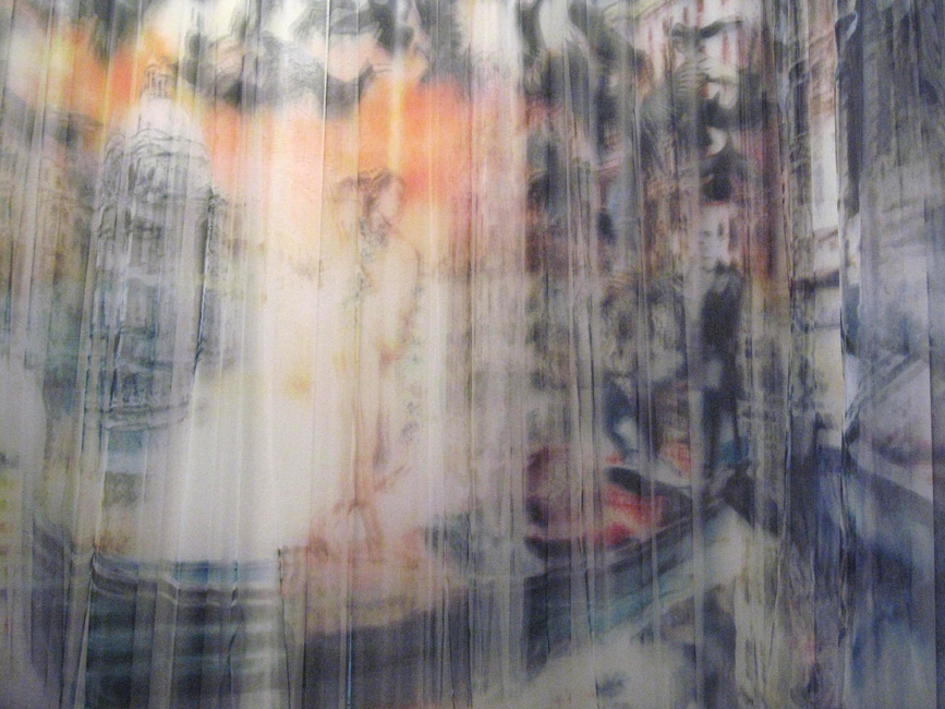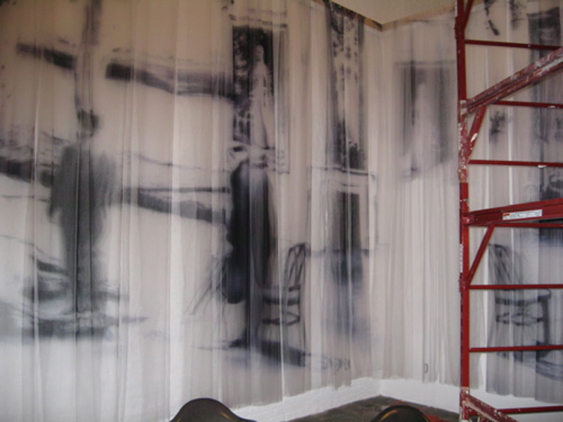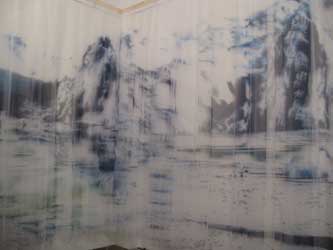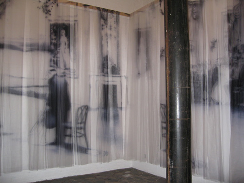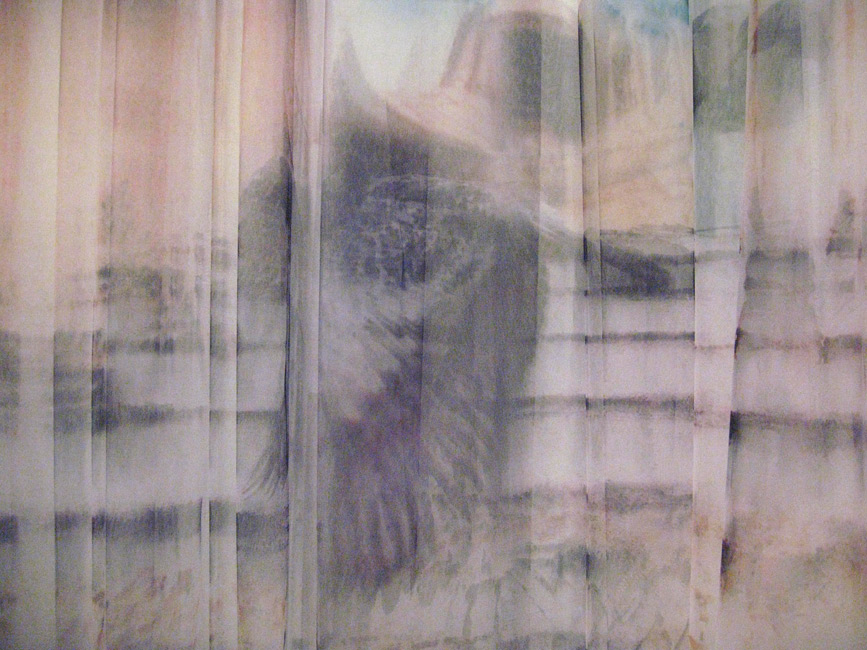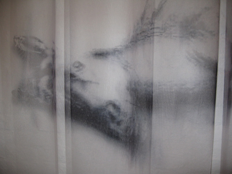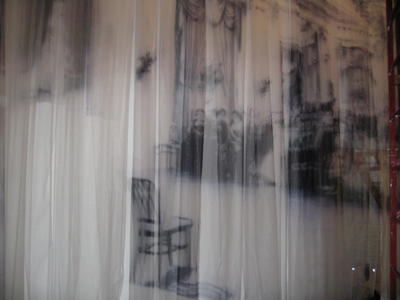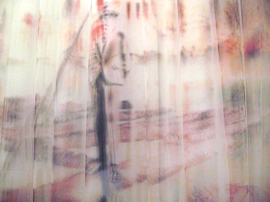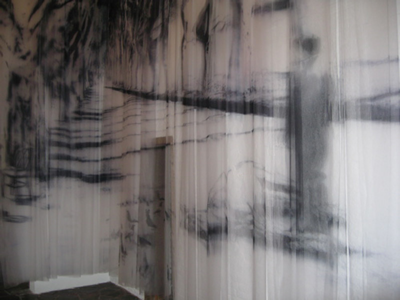 Rooms of wall size paintings in ink on pleated illusion (tulle curtains),