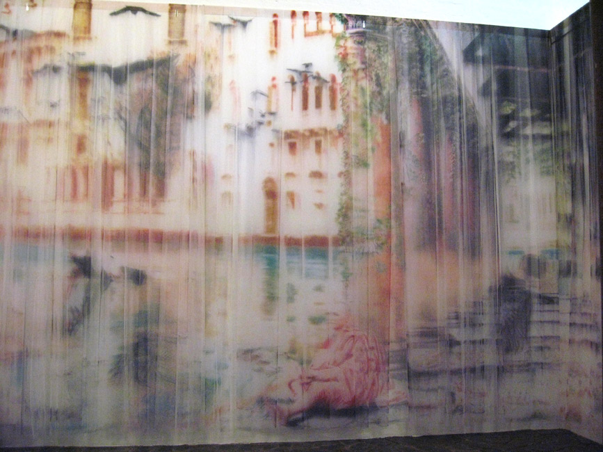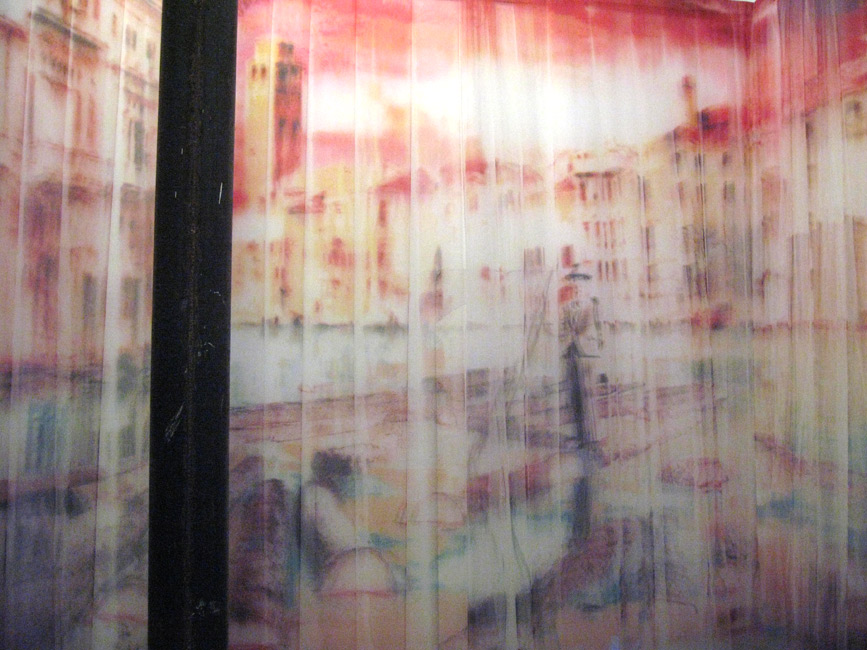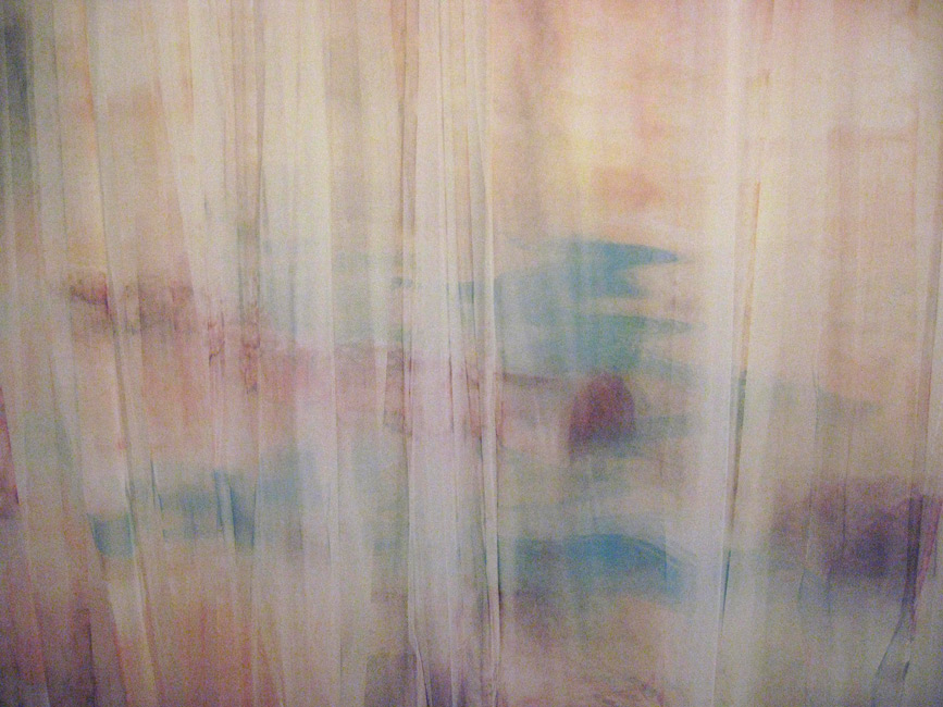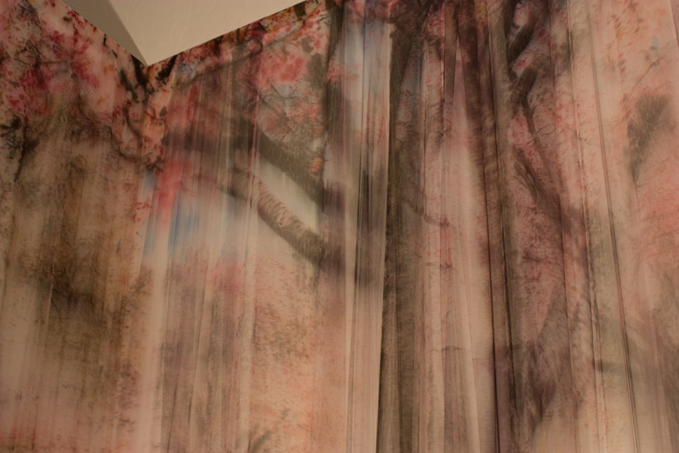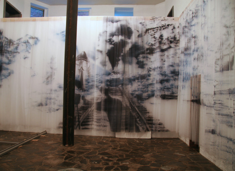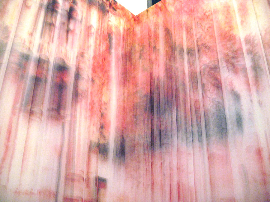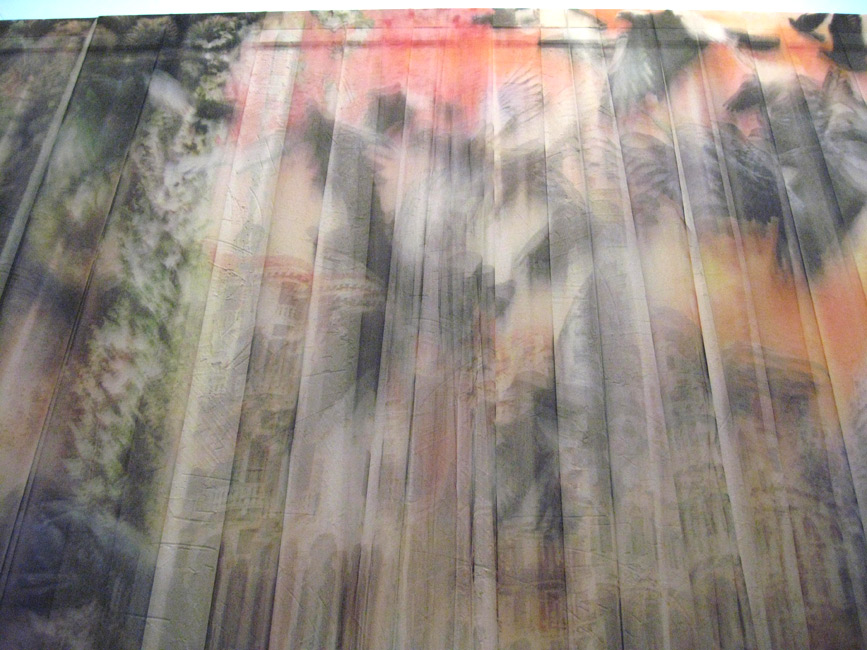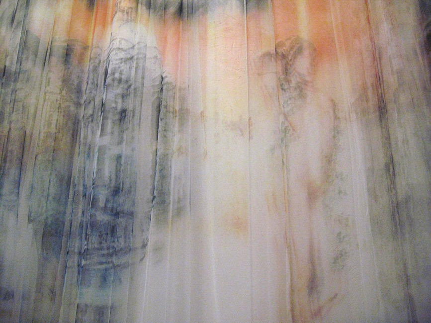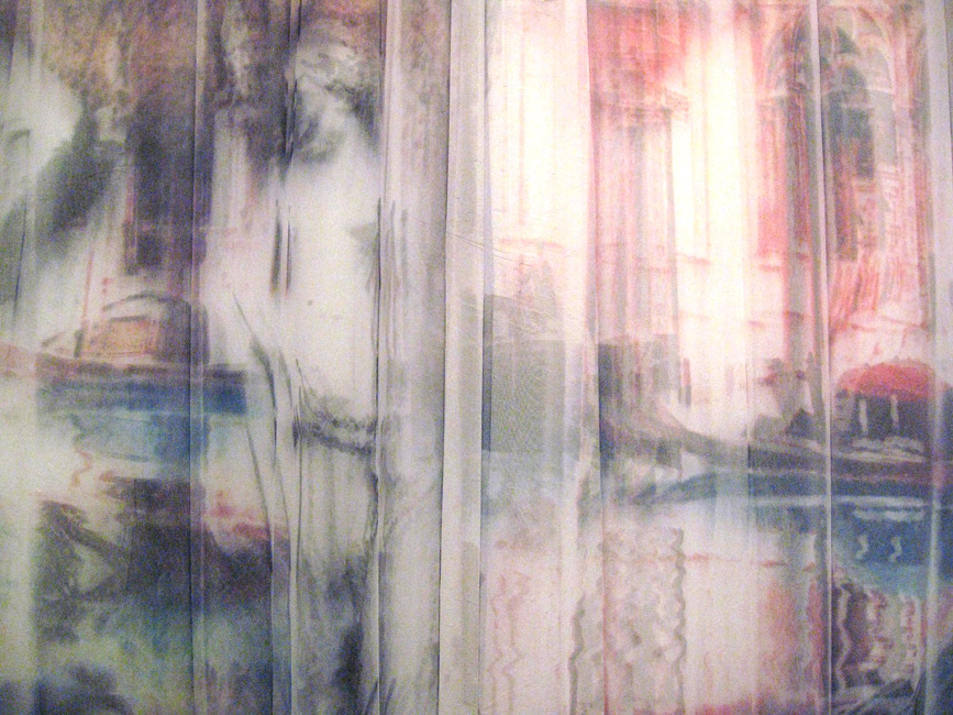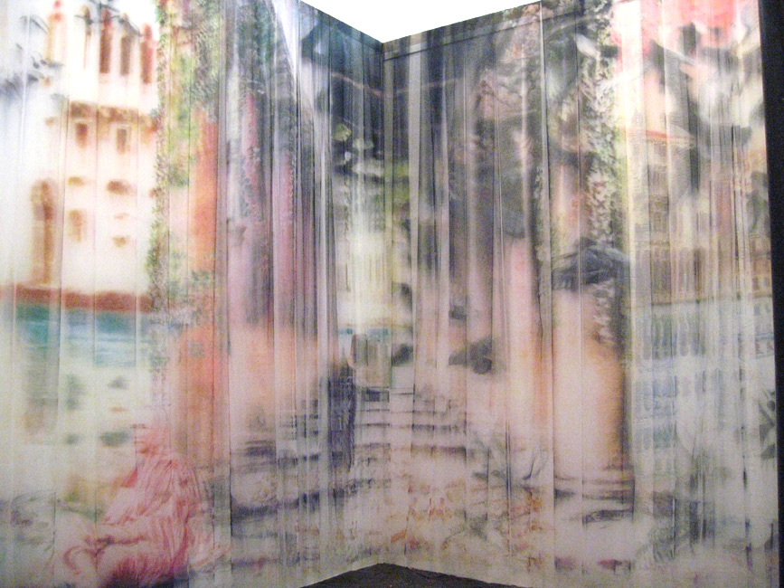 Rooms of wall size paintings in ink on pleated illusion (tulle curtains),