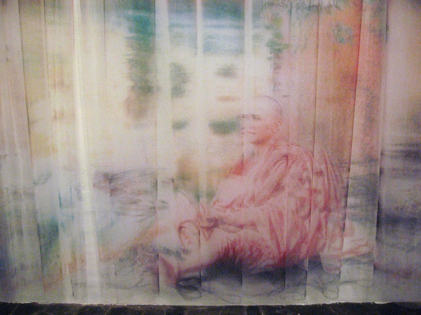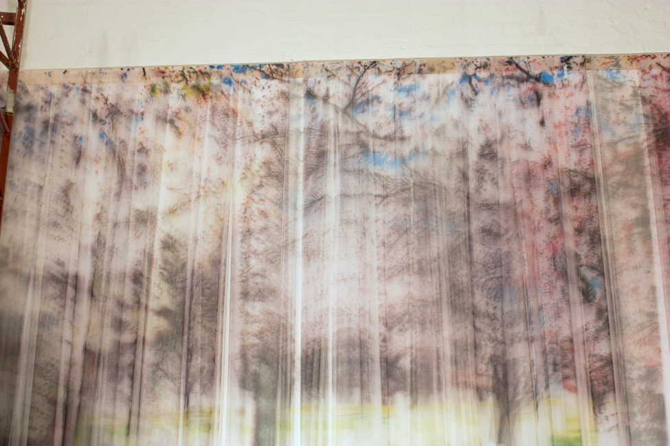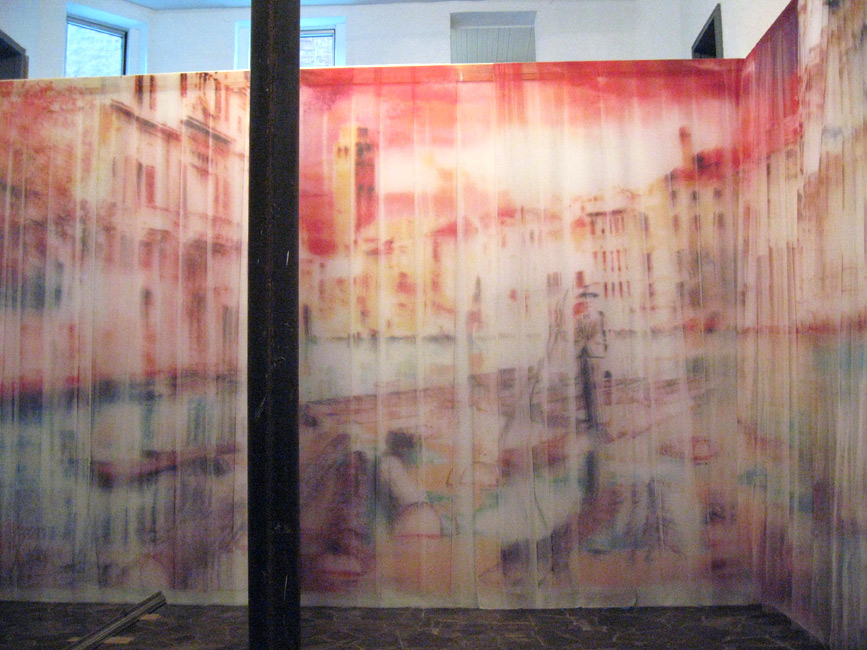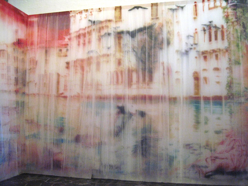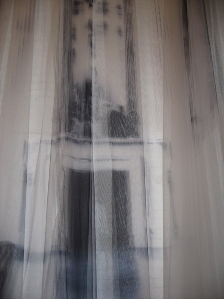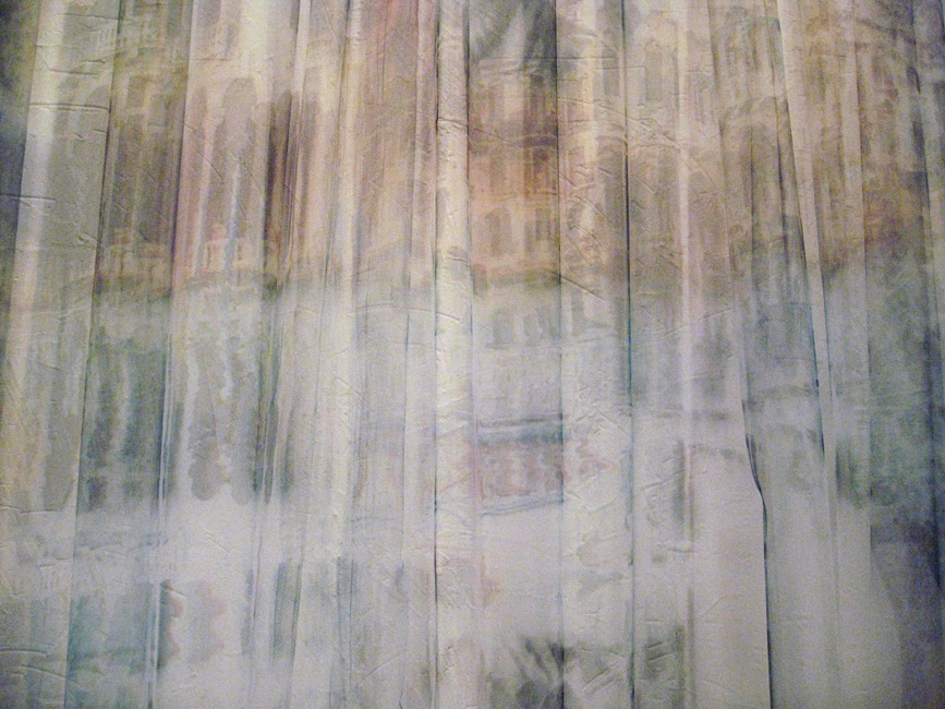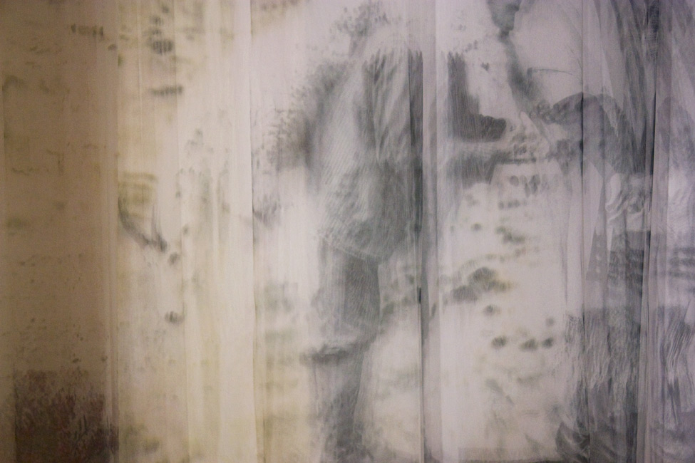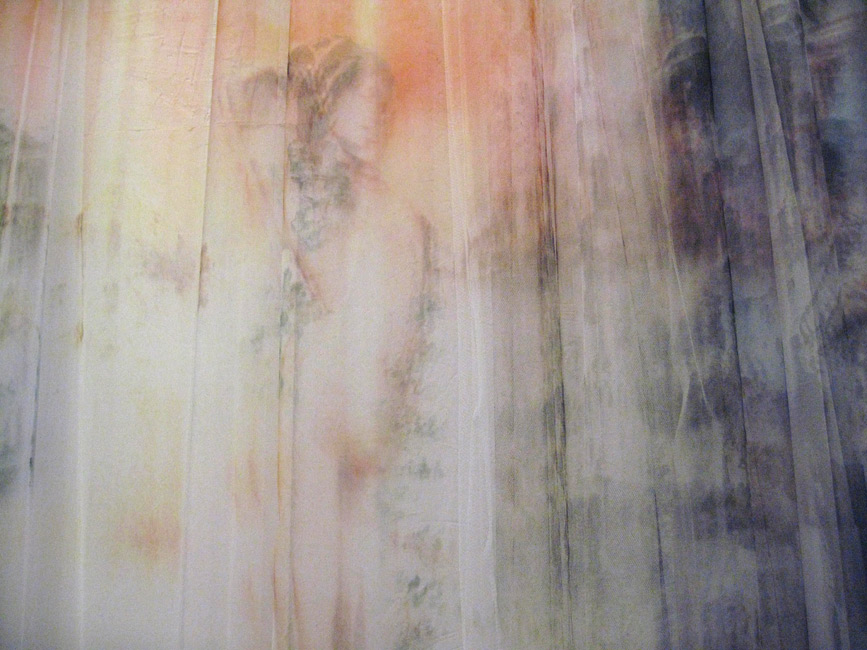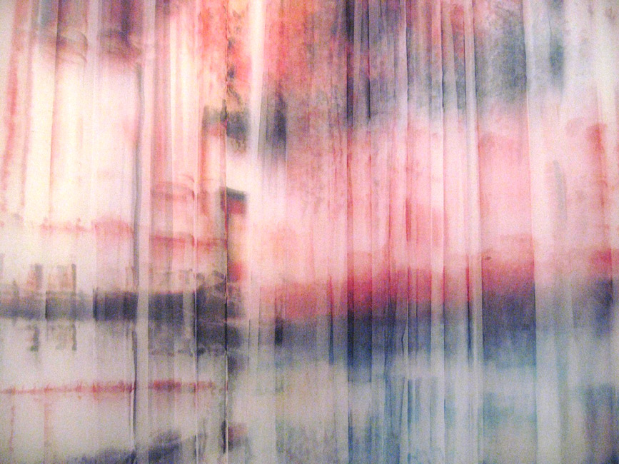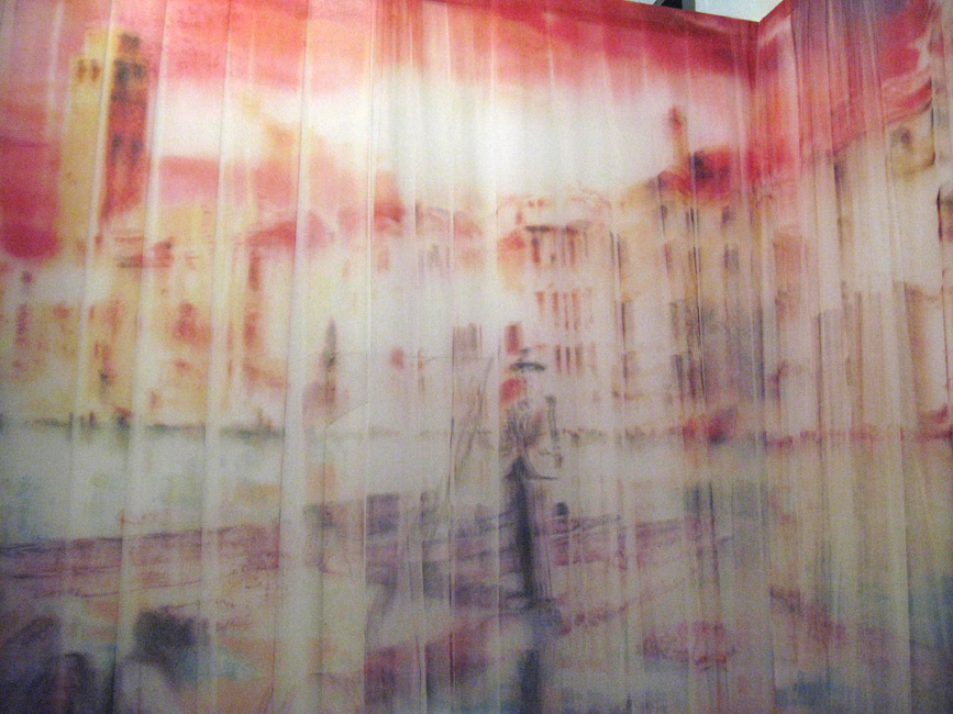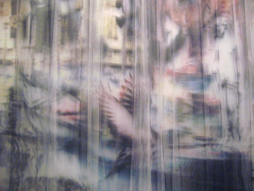 Rooms of wall size paintings in ink on pleated illusion (tulle curtains),