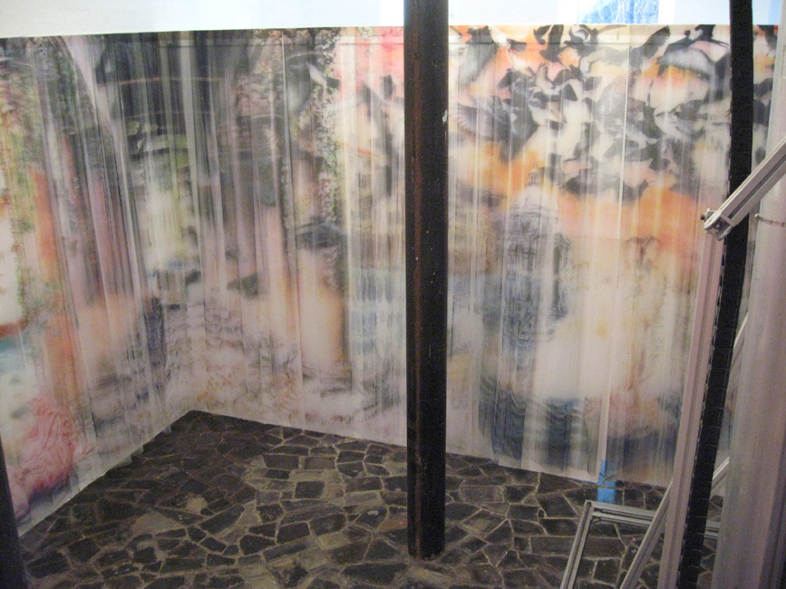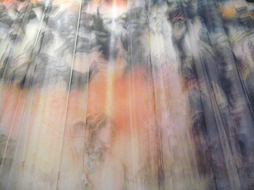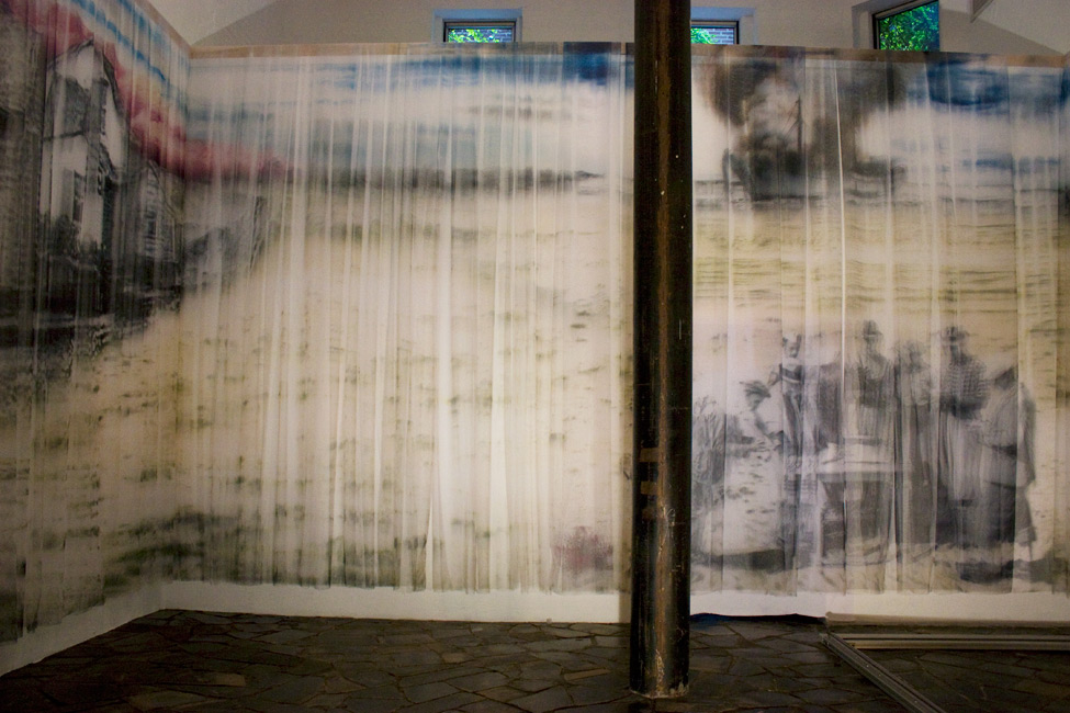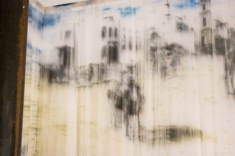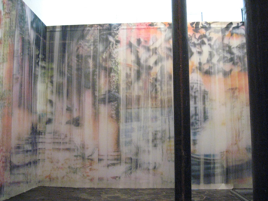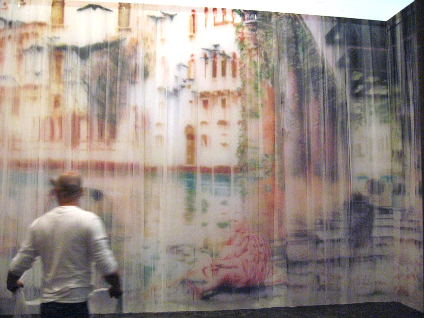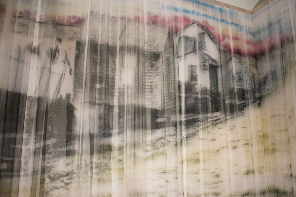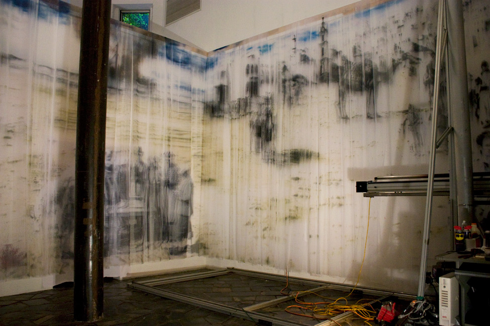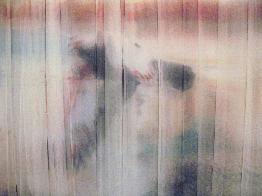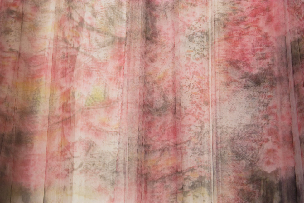 Rooms of wall size paintings in ink on pleated illusion (tulle curtains),