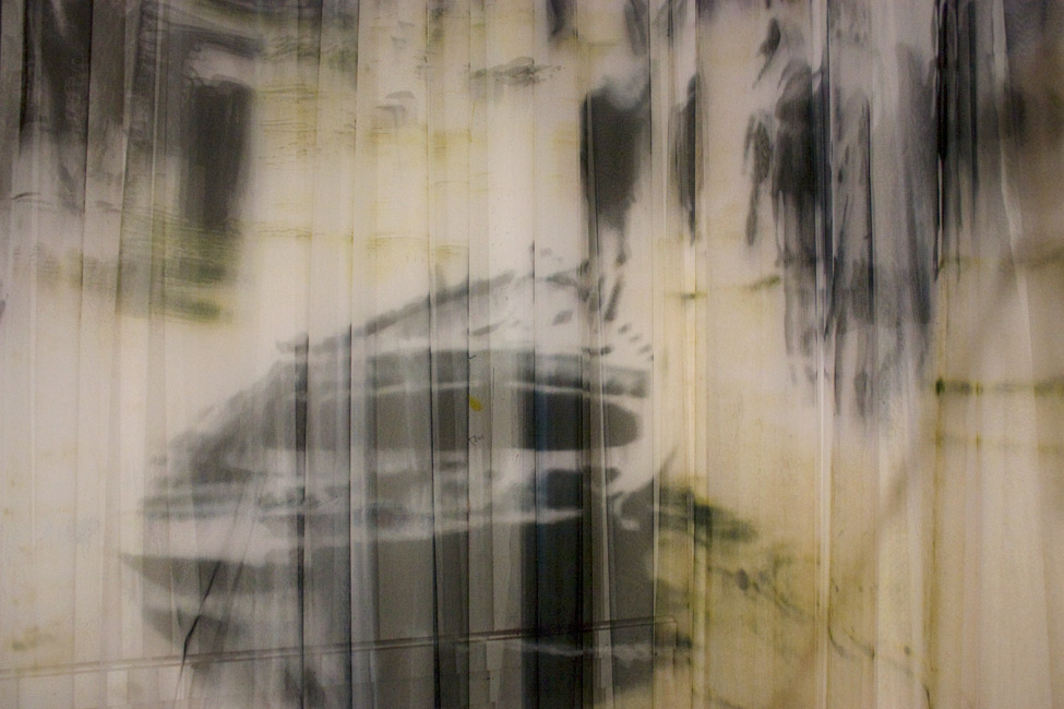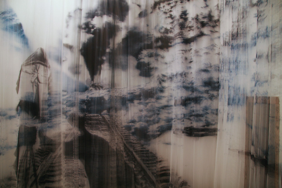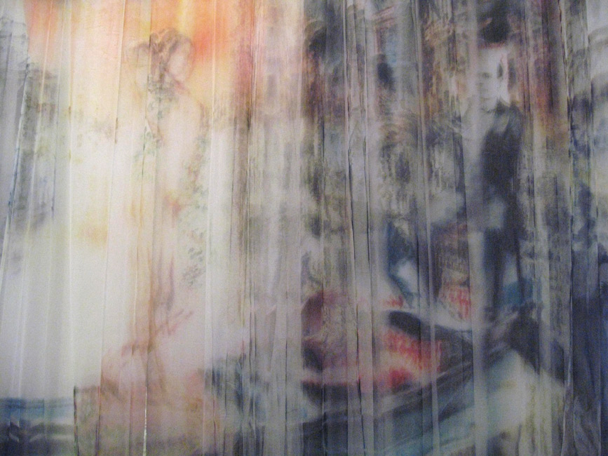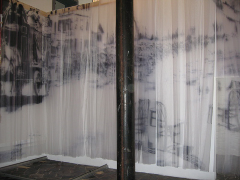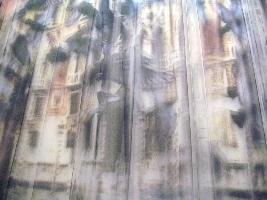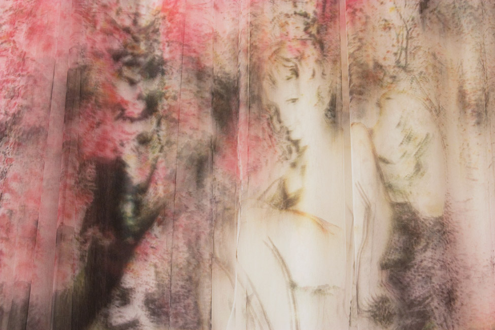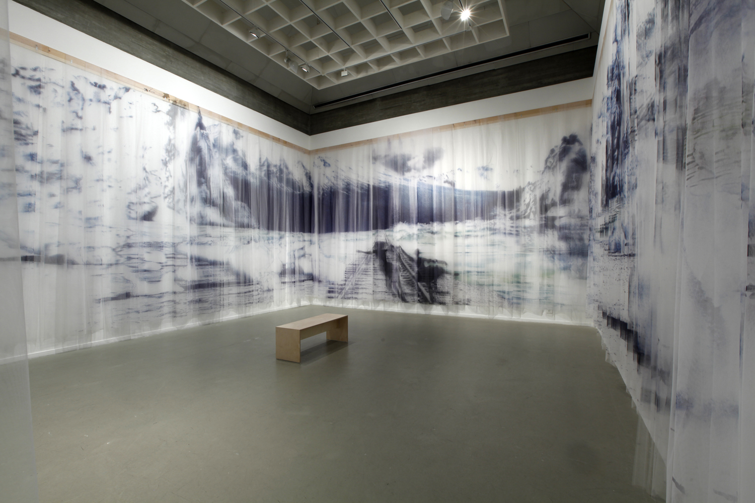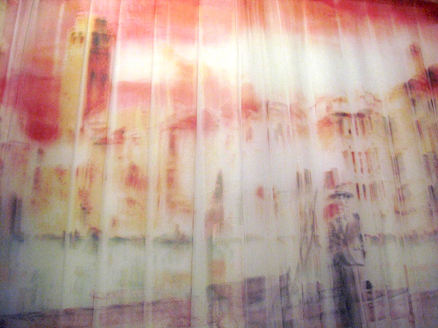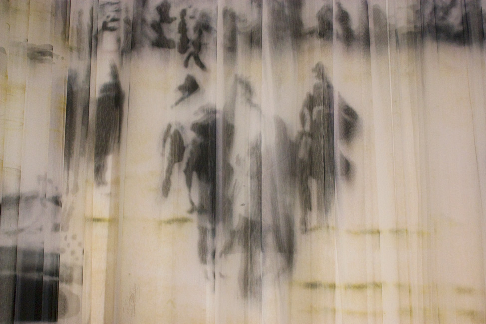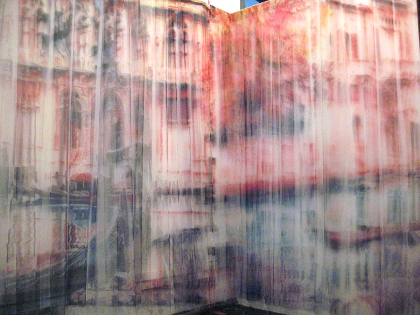 Rooms of wall size paintings in ink on pleated illusion (tulle curtains),