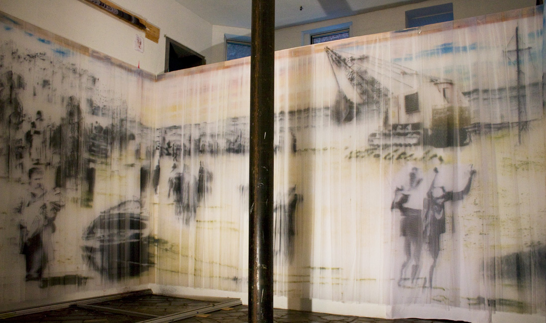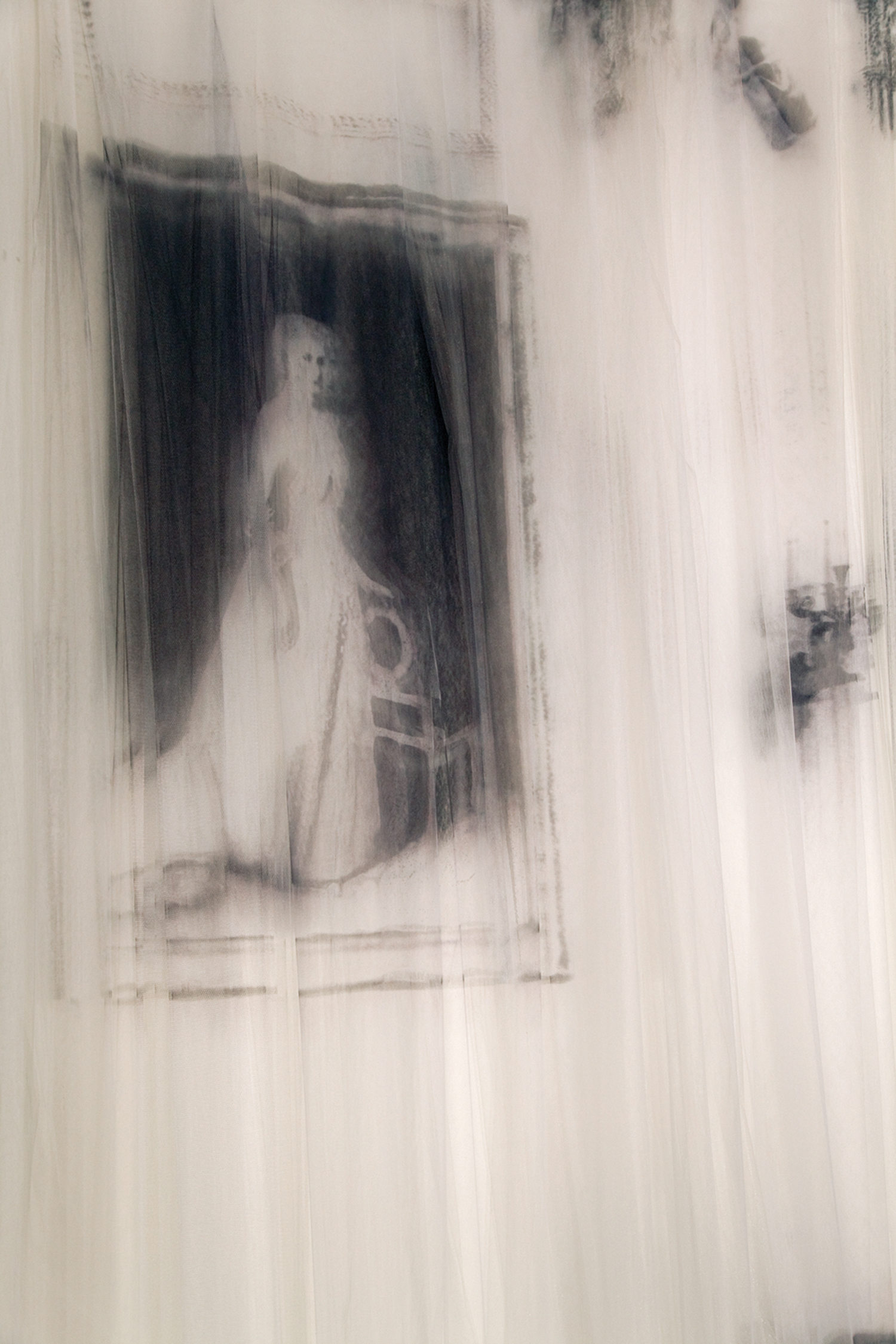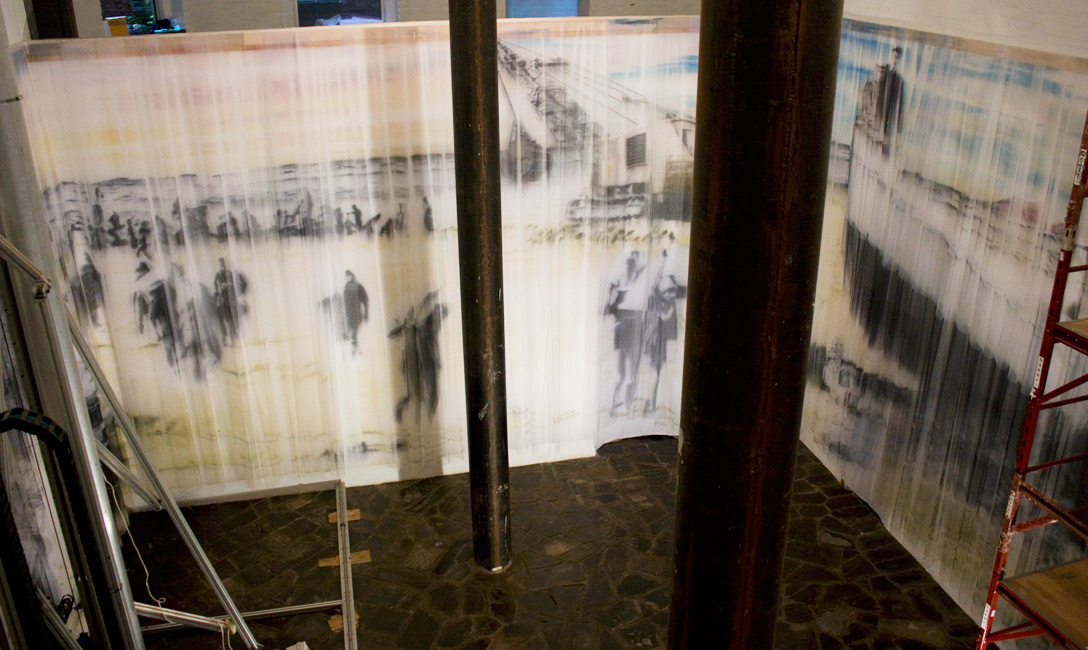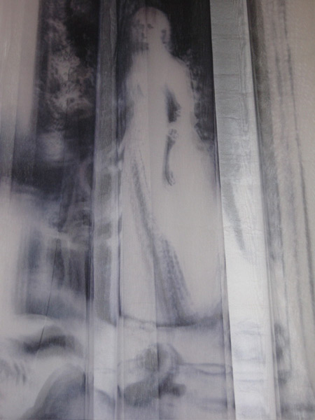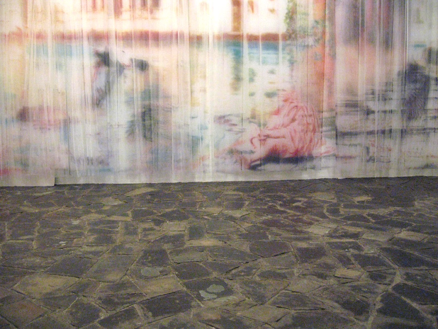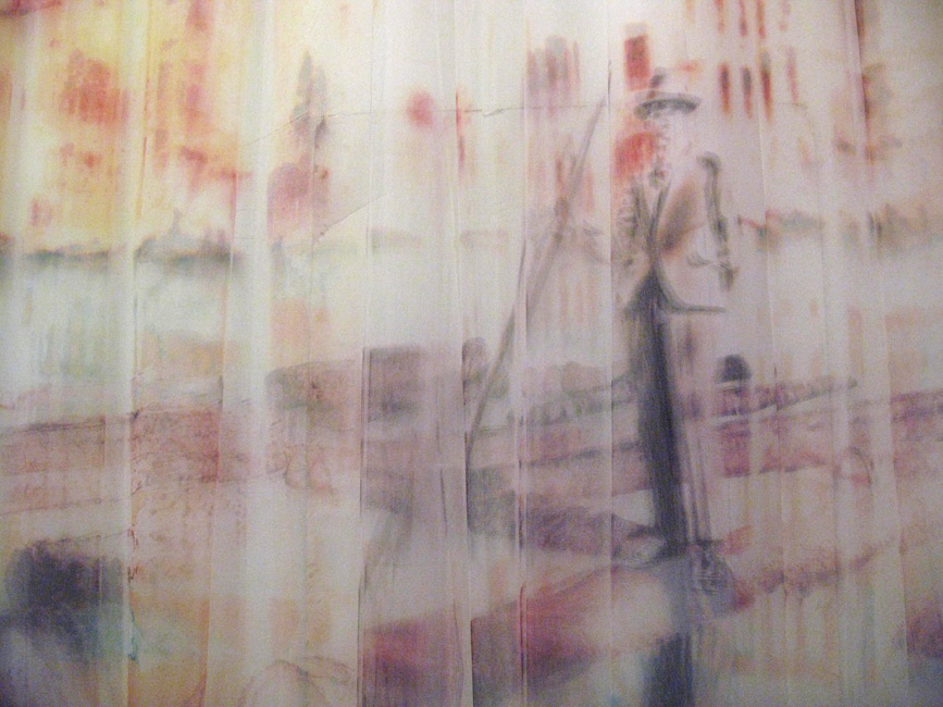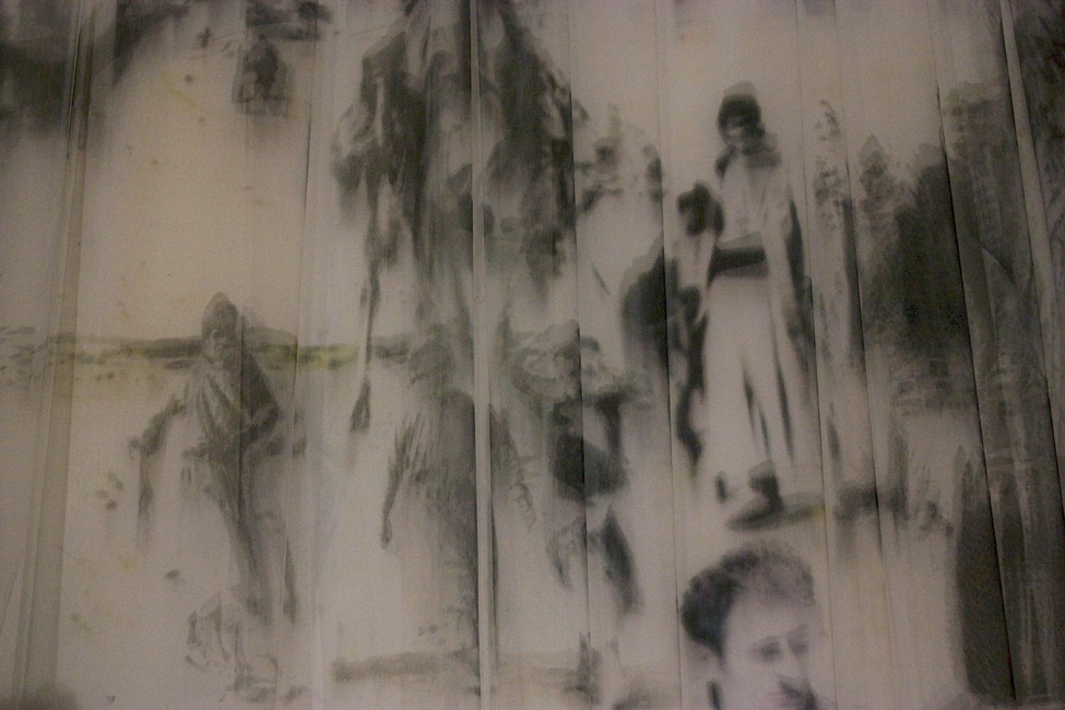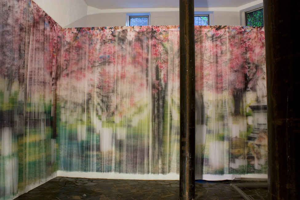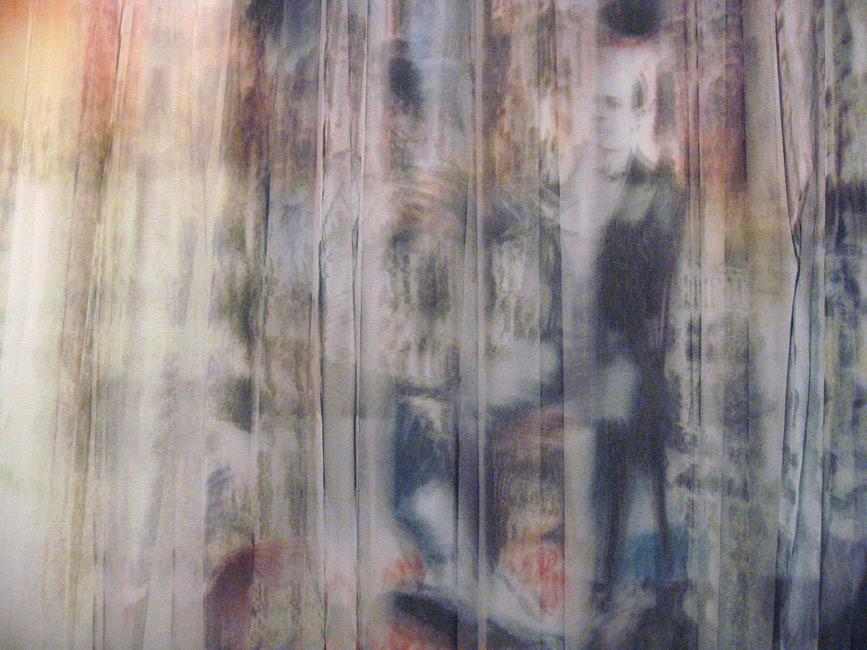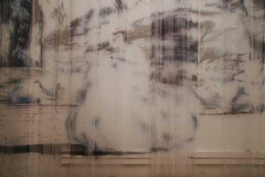 Rooms of wall size paintings in ink on pleated illusion (tulle curtains),