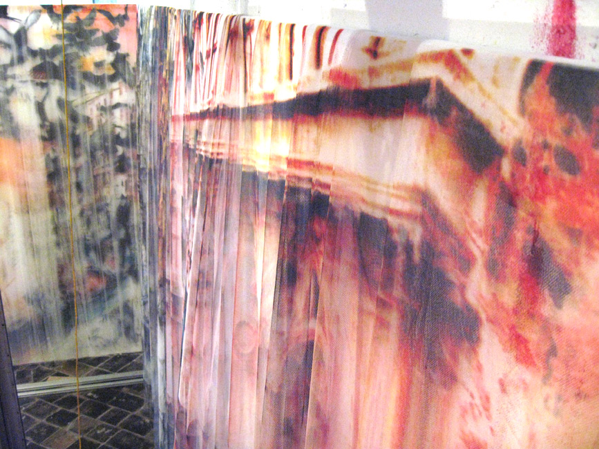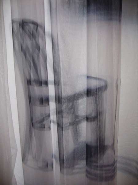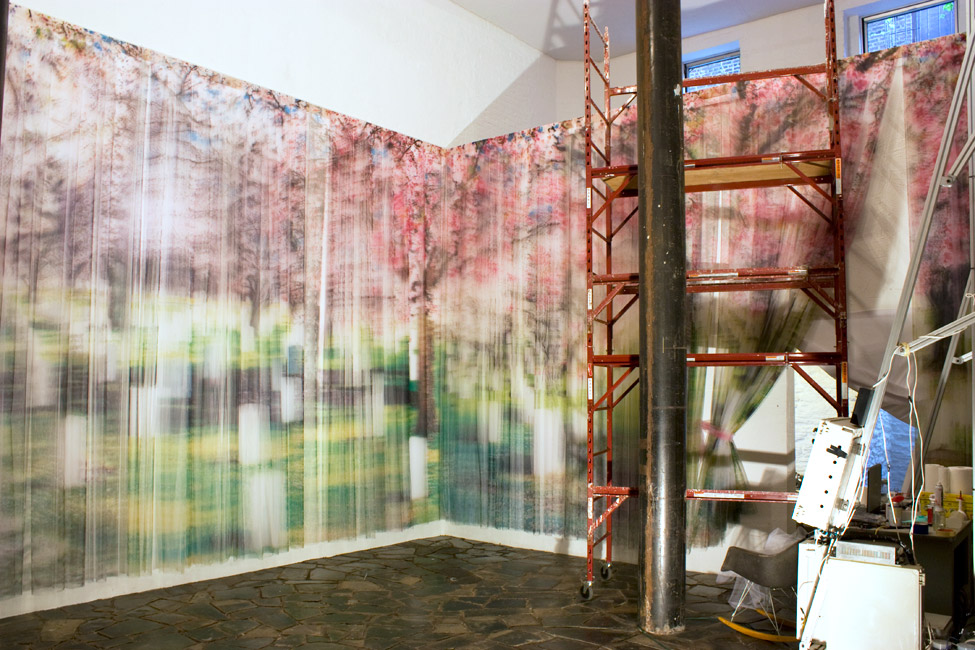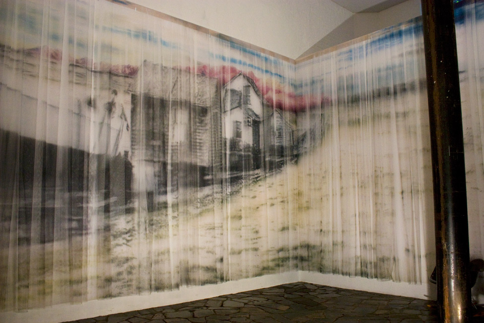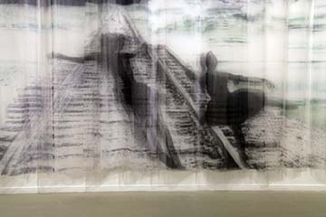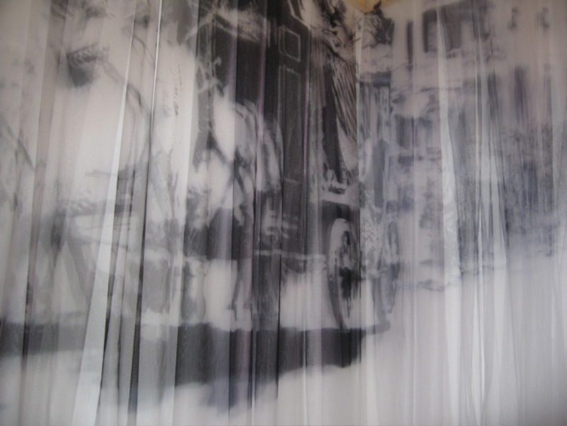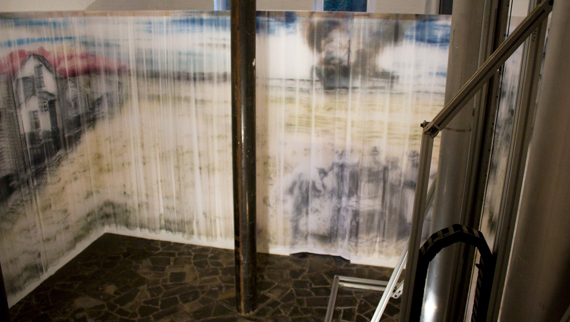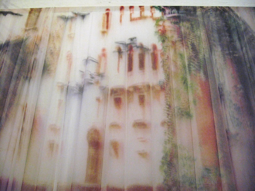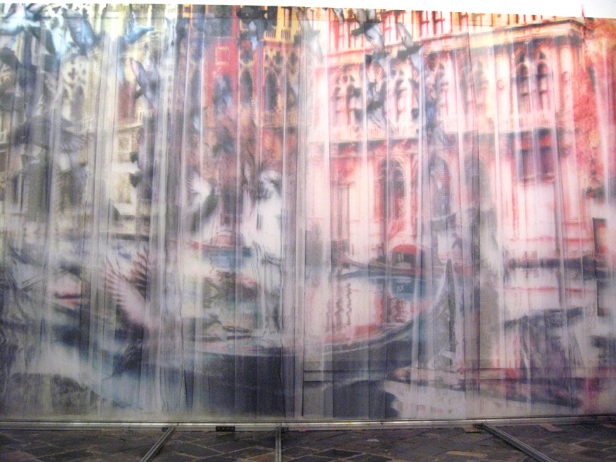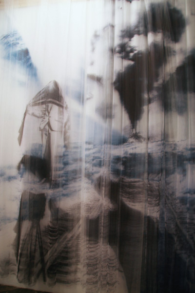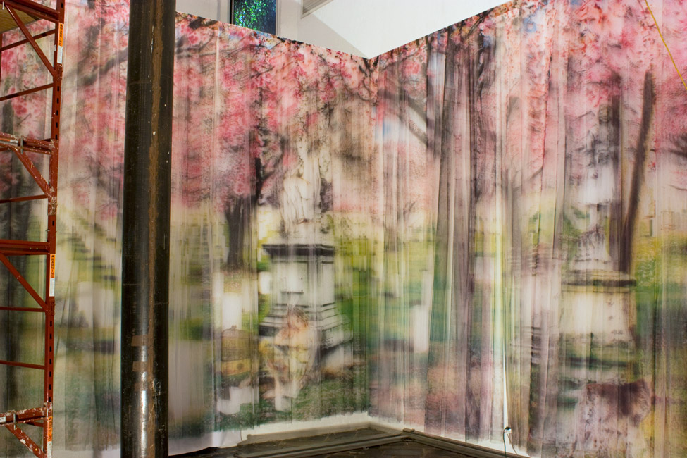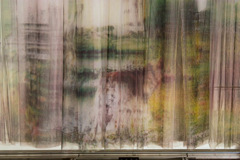 Rooms of wall size paintings in ink on pleated illusion (tulle curtains),