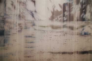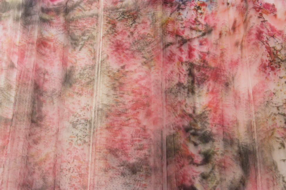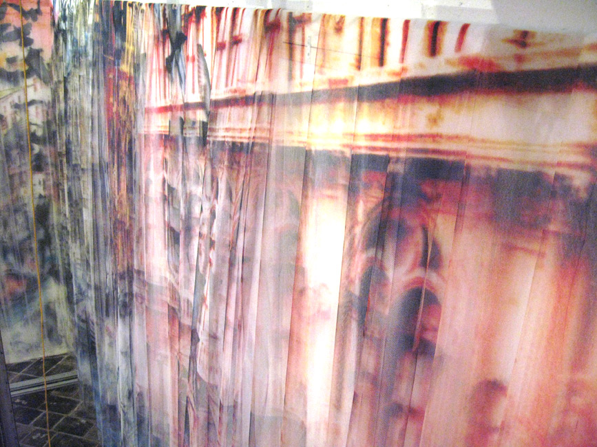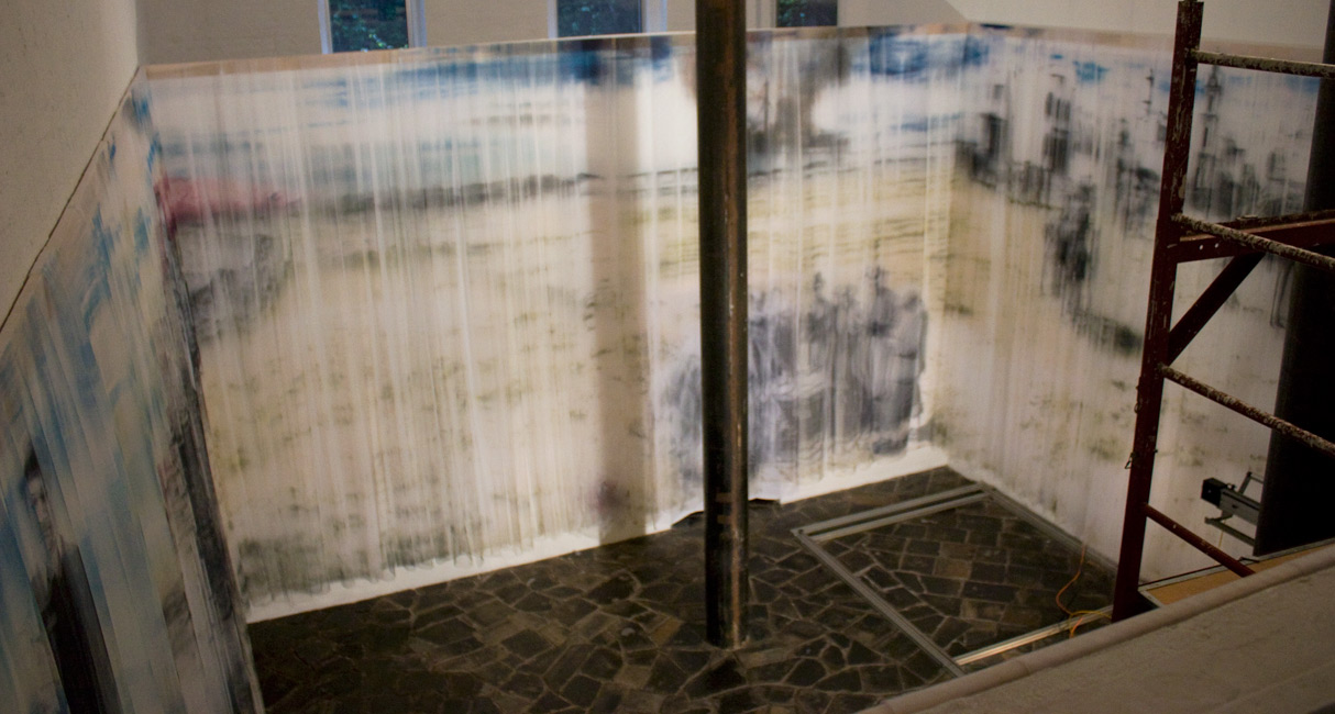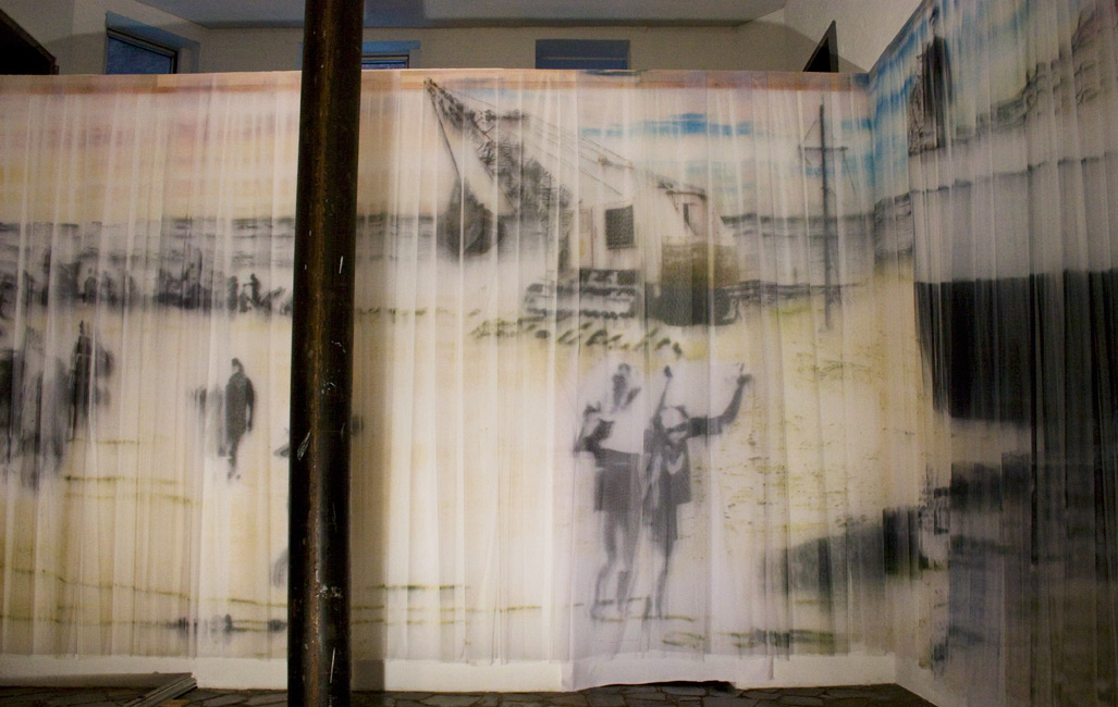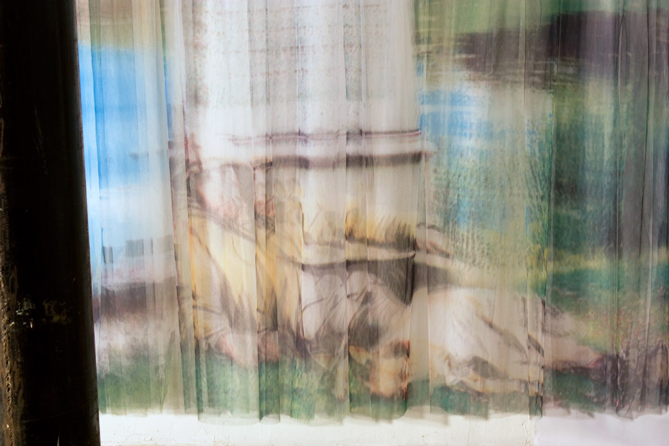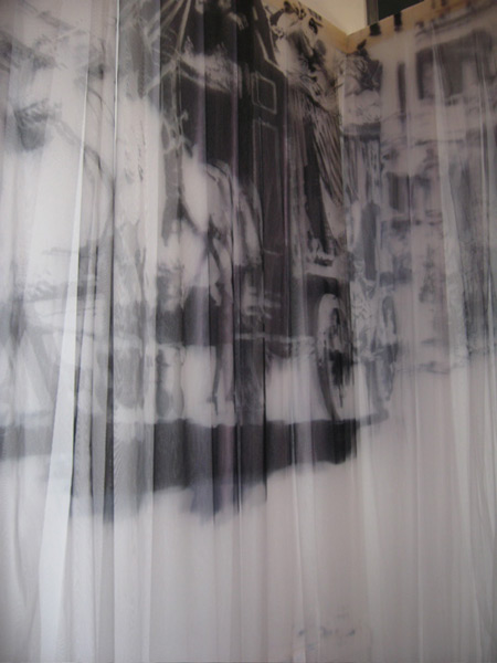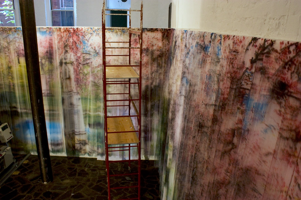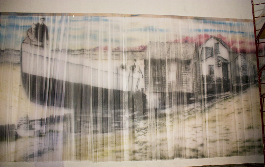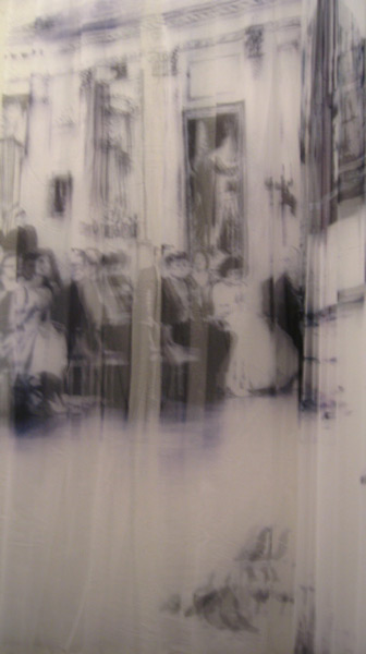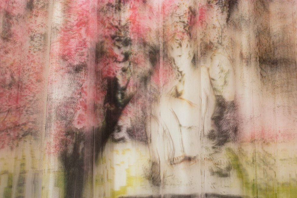 Rooms of wall size paintings in ink on pleated illusion (tulle curtains),