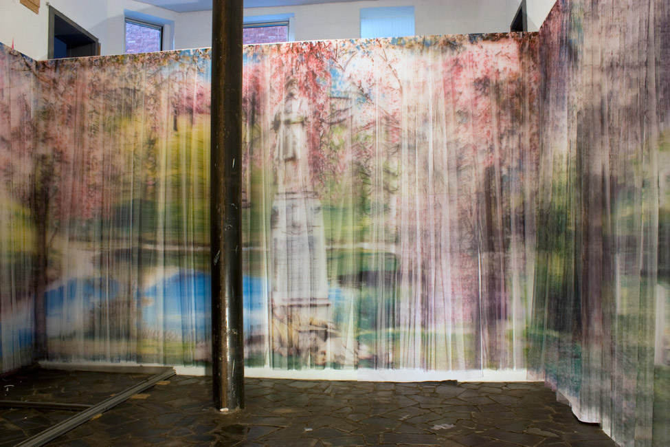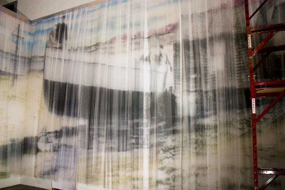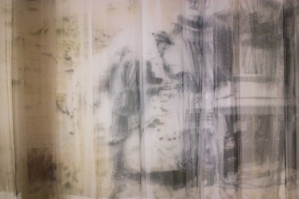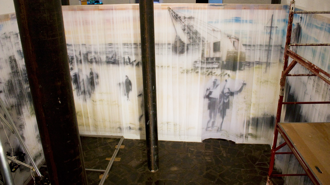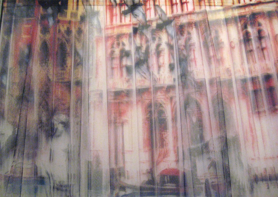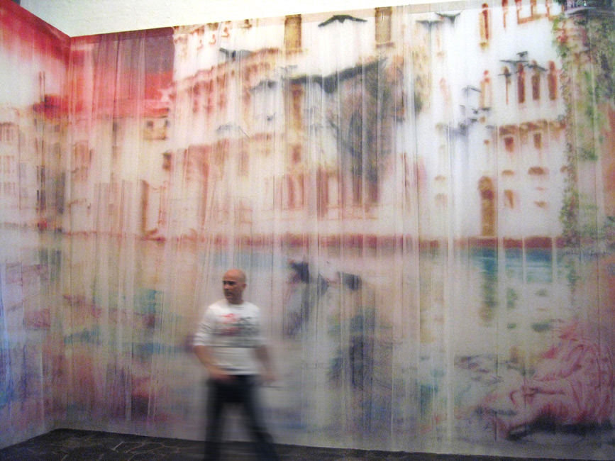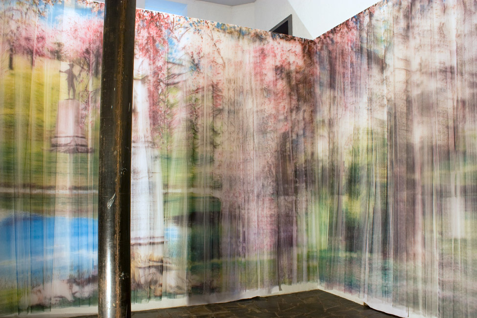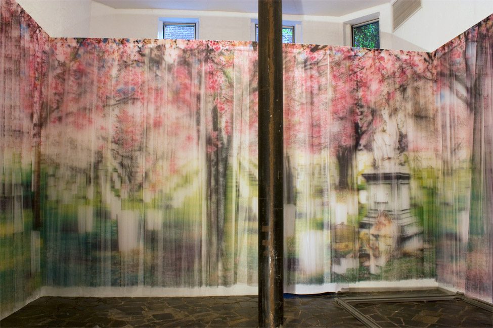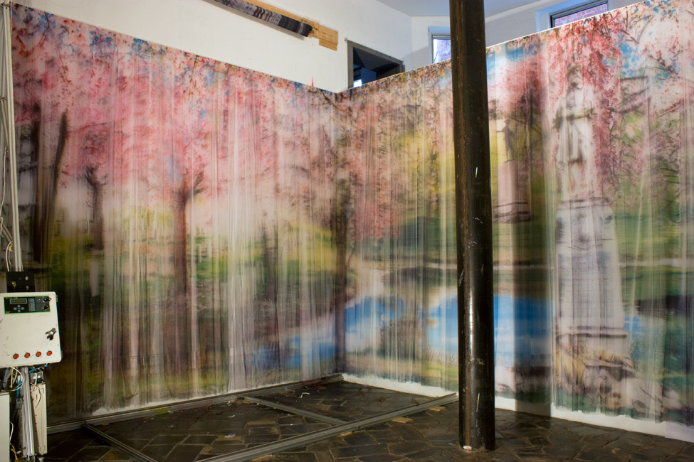 Rooms of wall size paintings in ink on pleated illusion (tulle curtains),