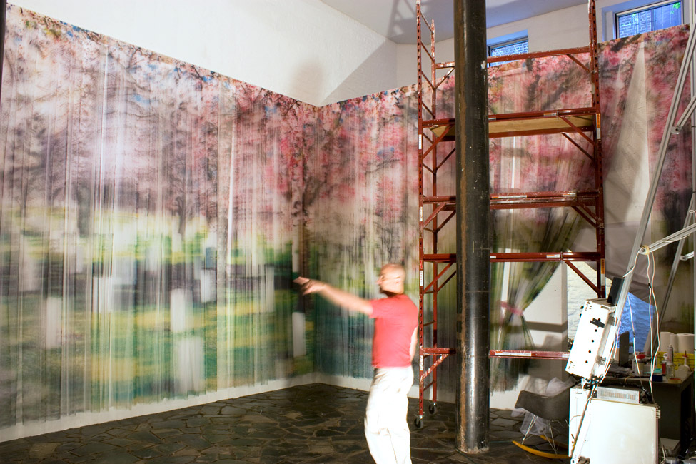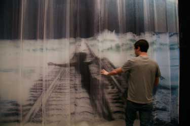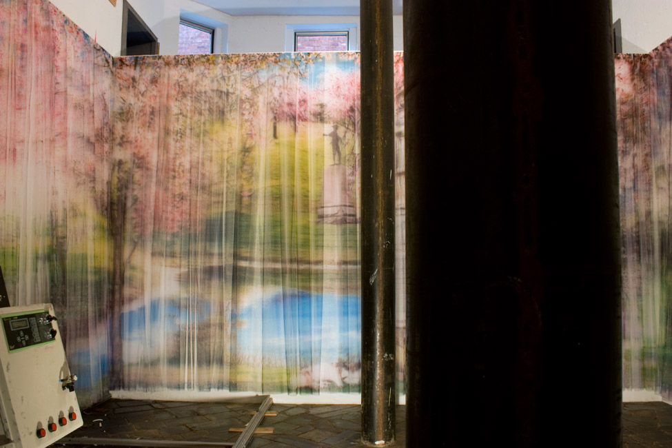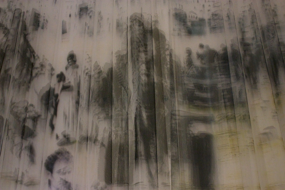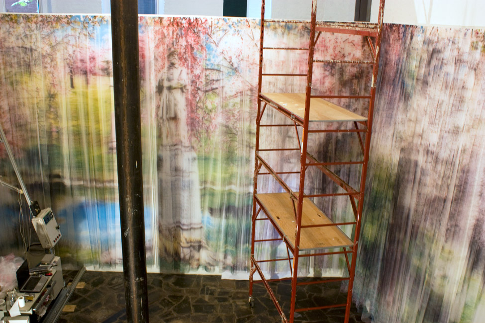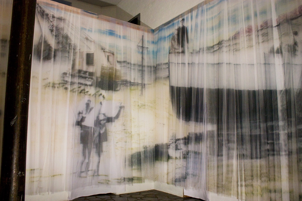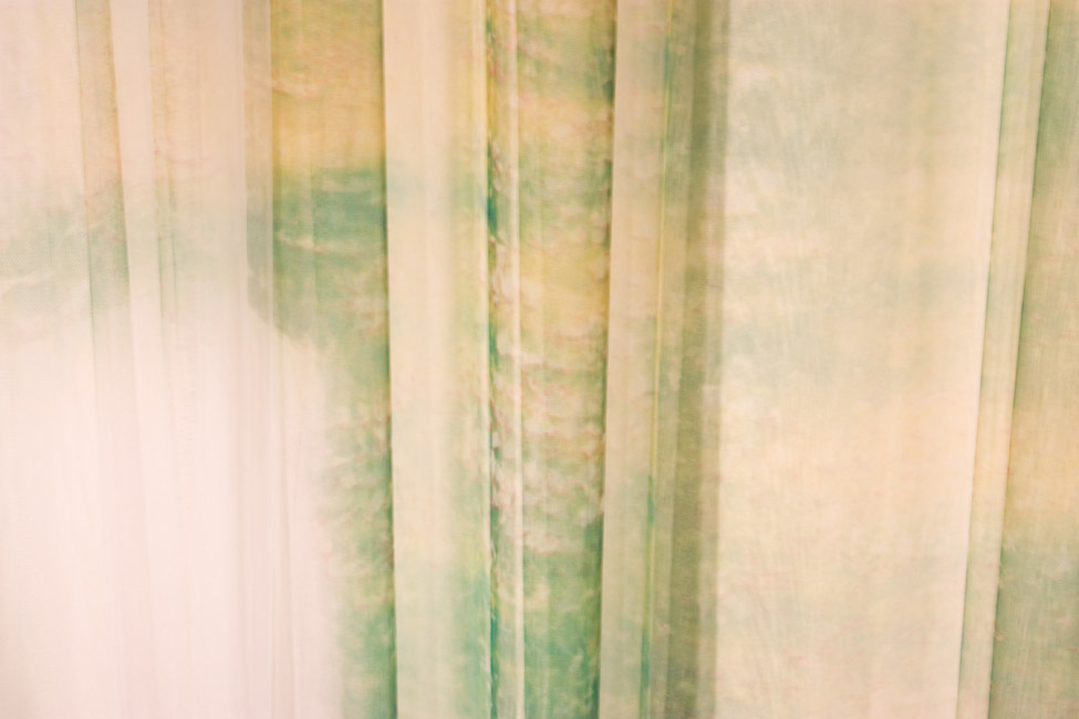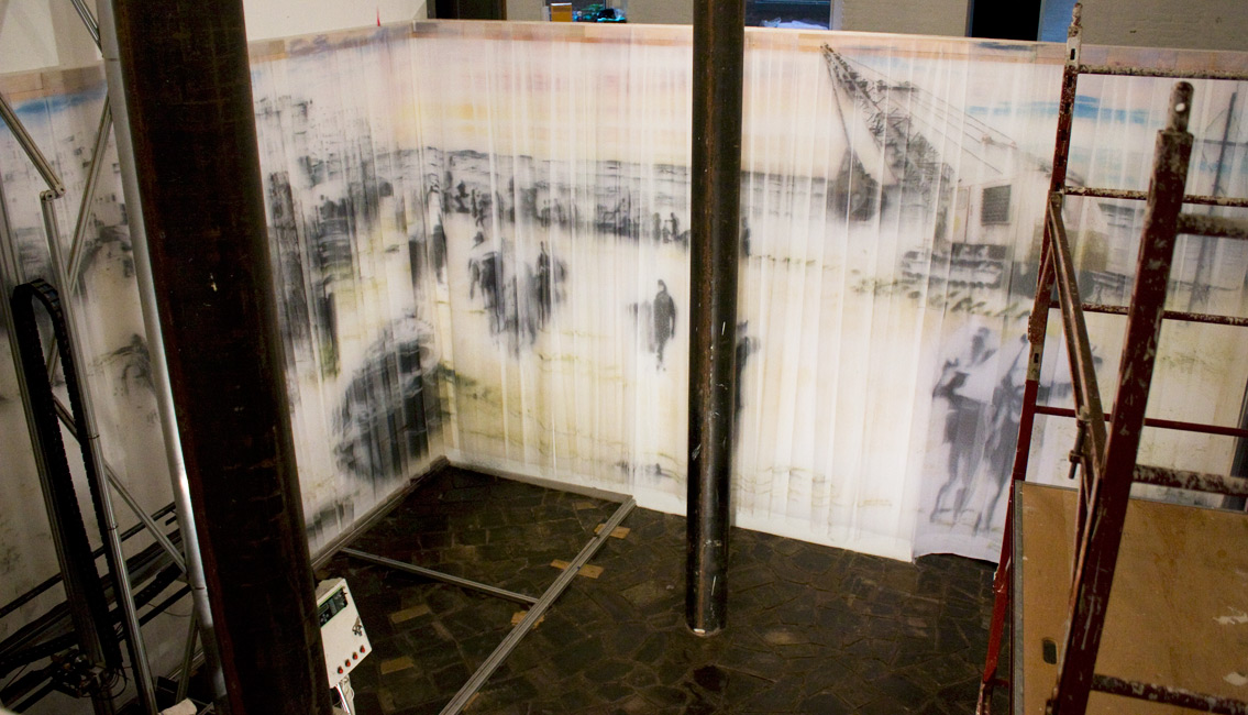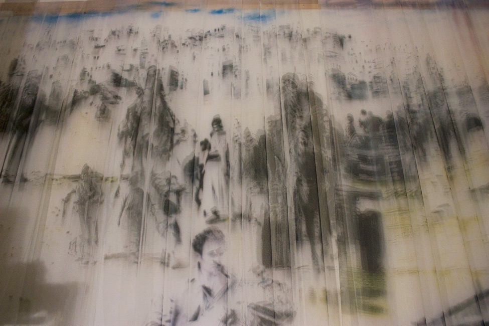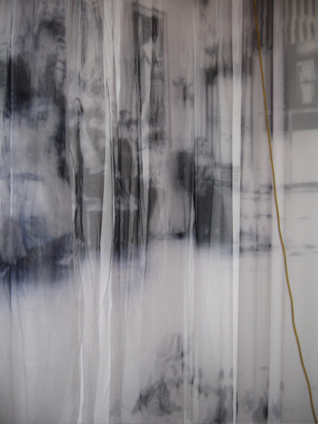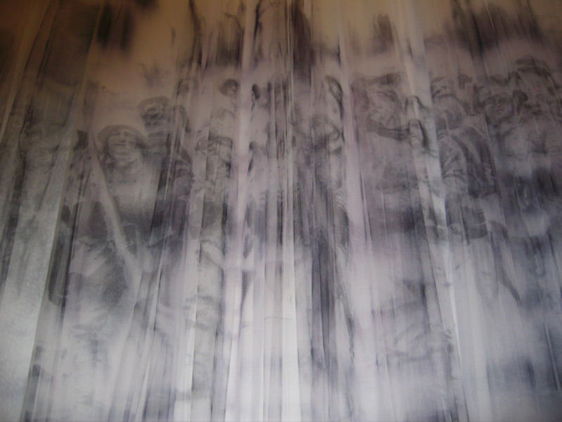 Rooms of wall size paintings in ink on pleated illusion (tulle curtains),