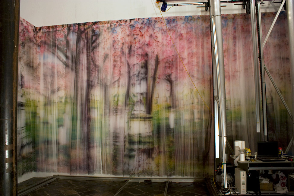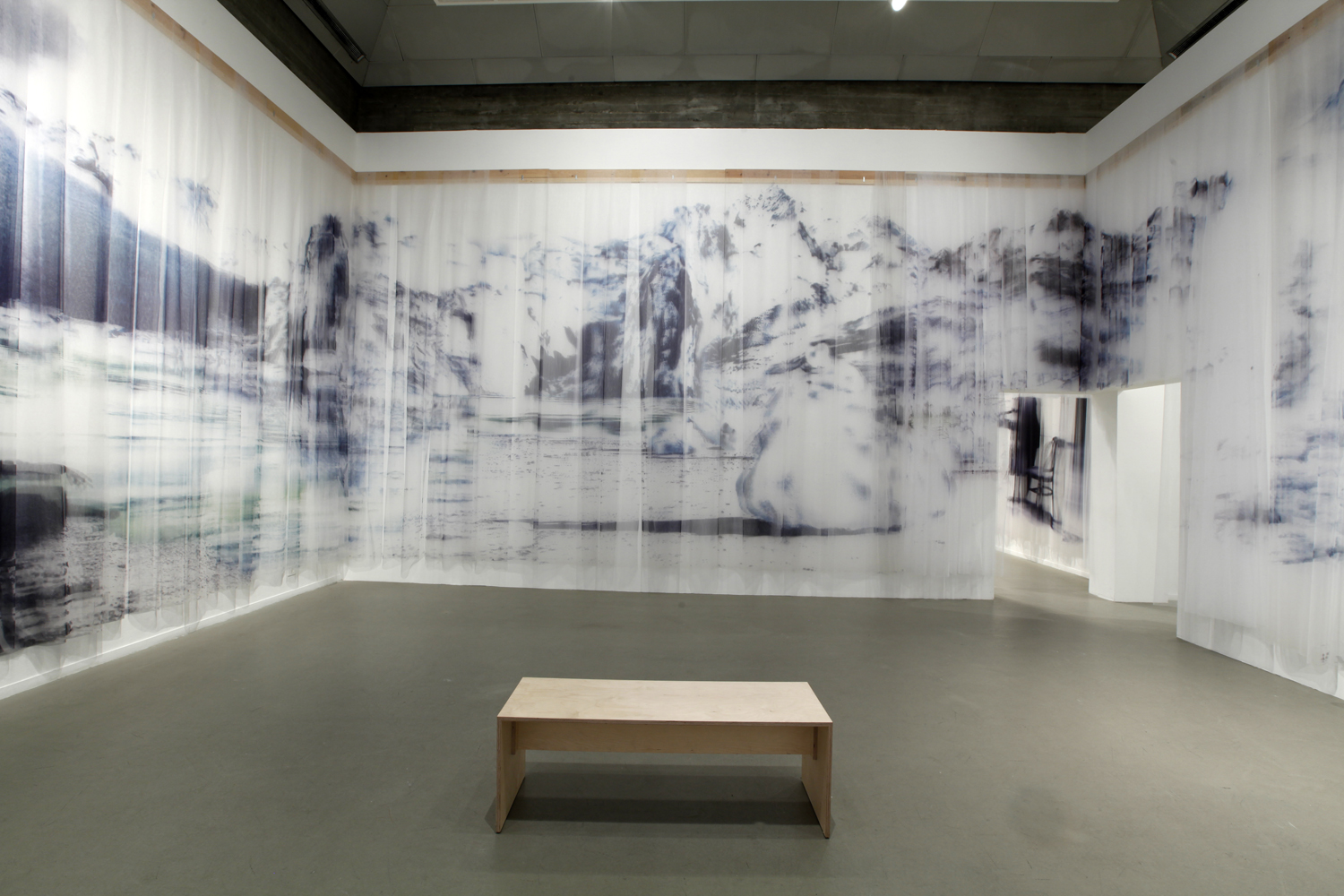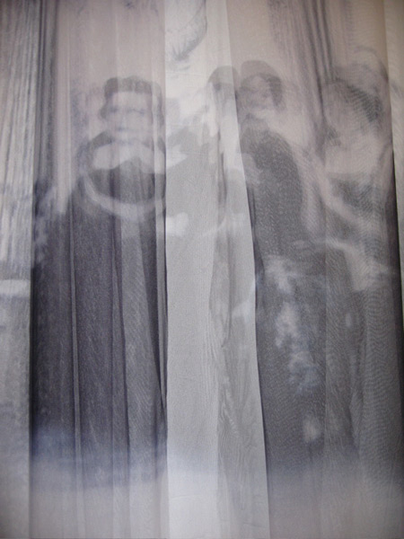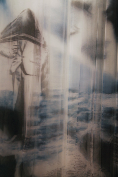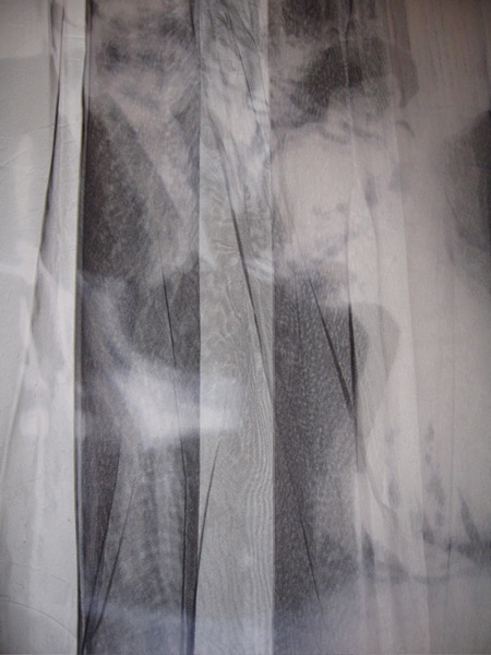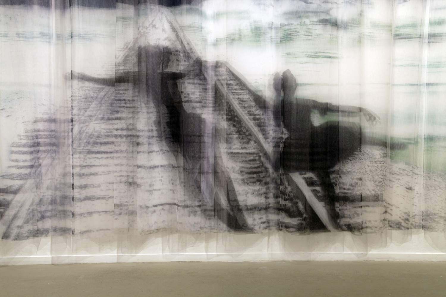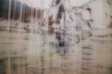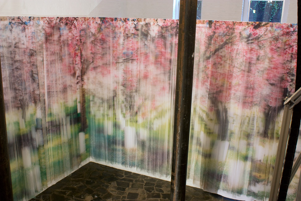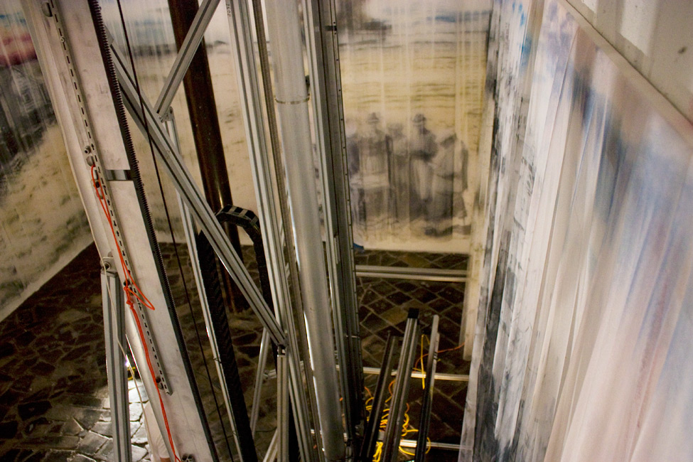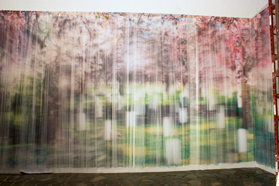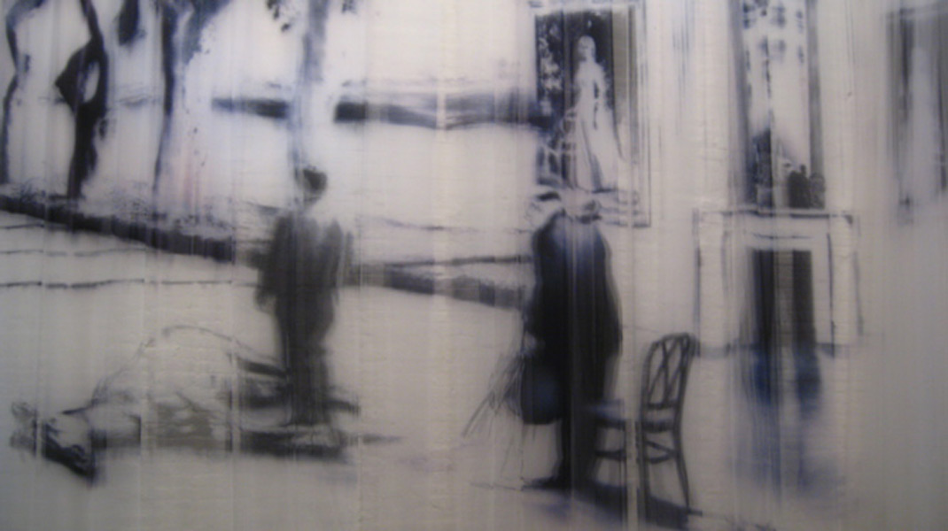 Rooms of wall size paintings in ink on pleated illusion (tulle curtains),