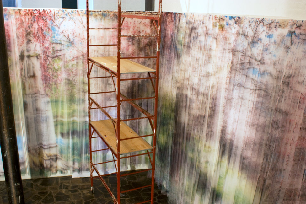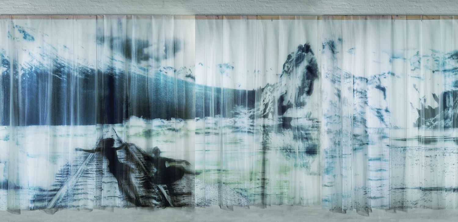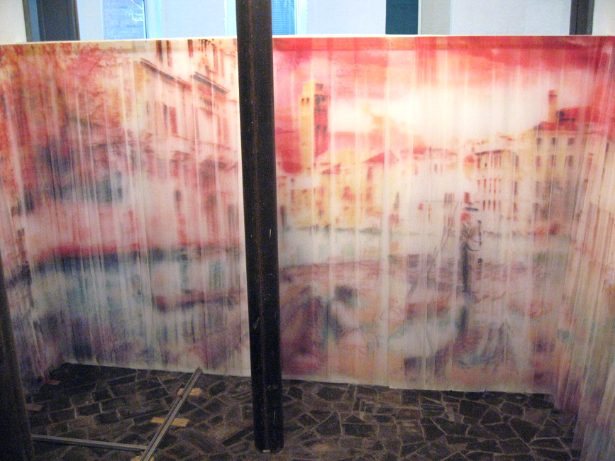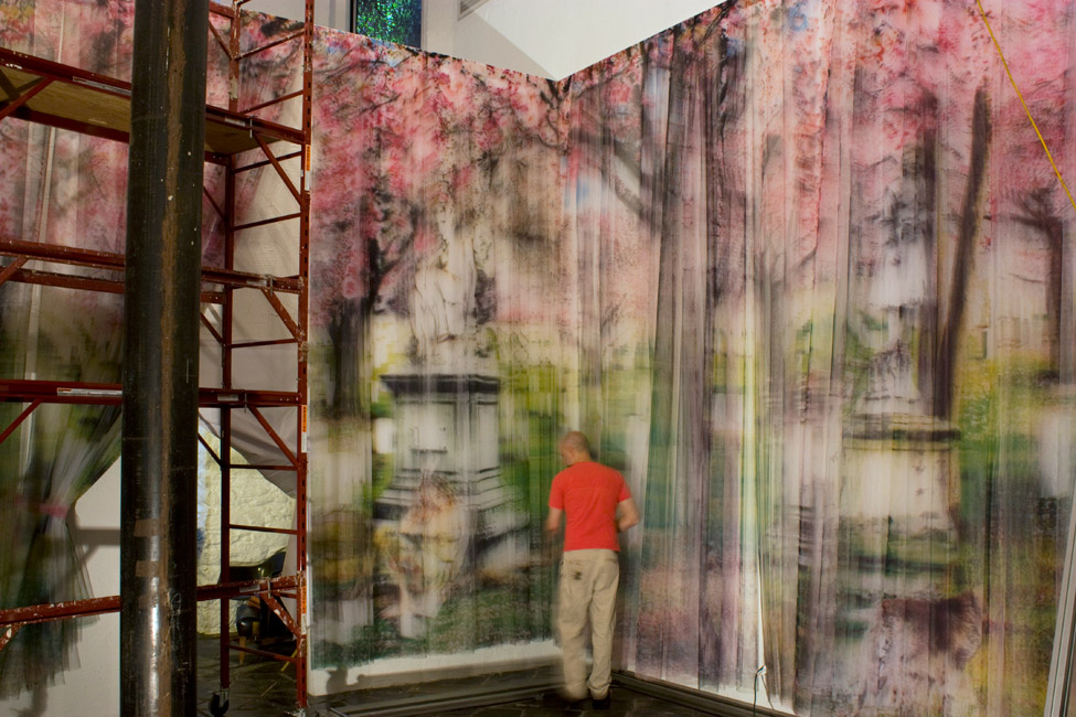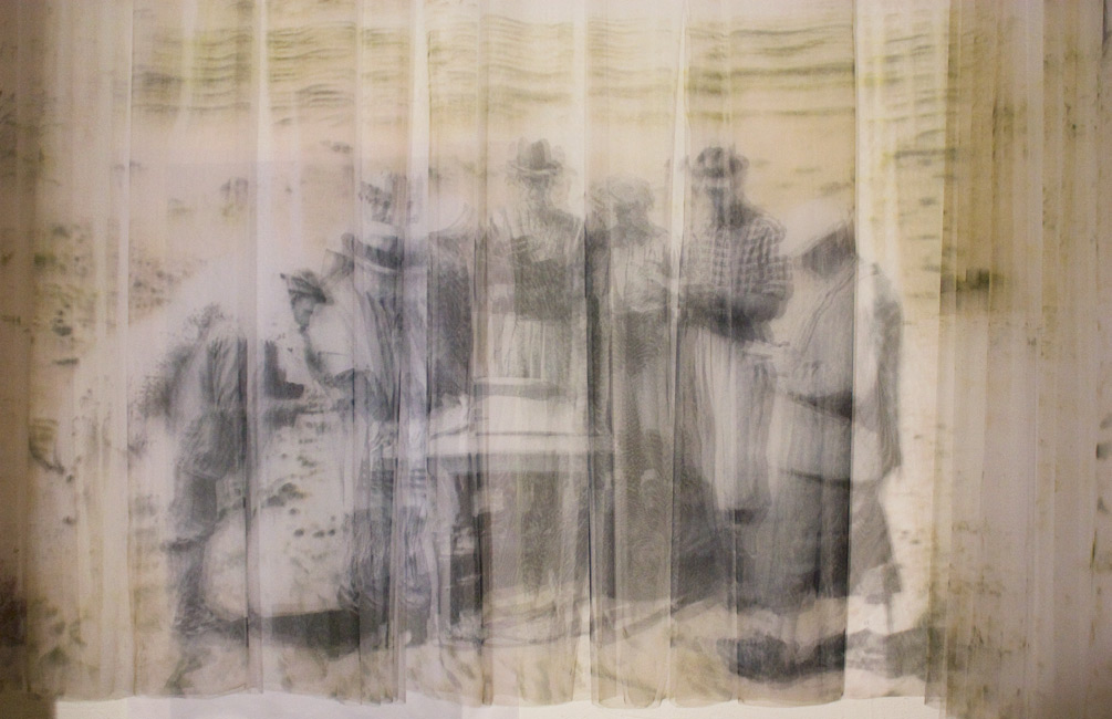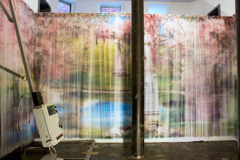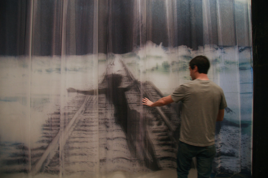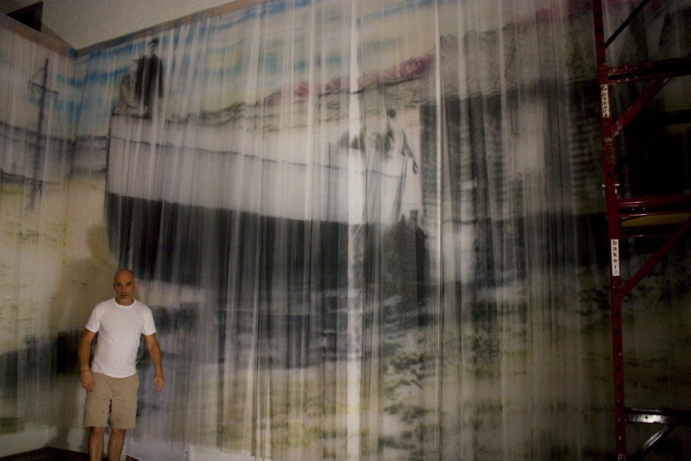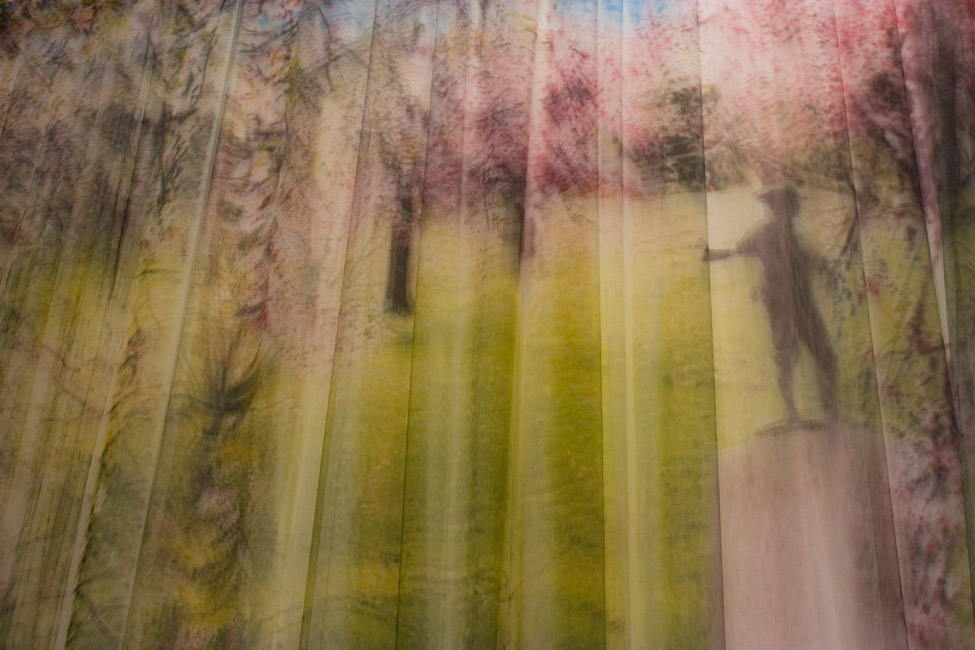 Rooms of wall size paintings in ink on pleated illusion (tulle curtains),