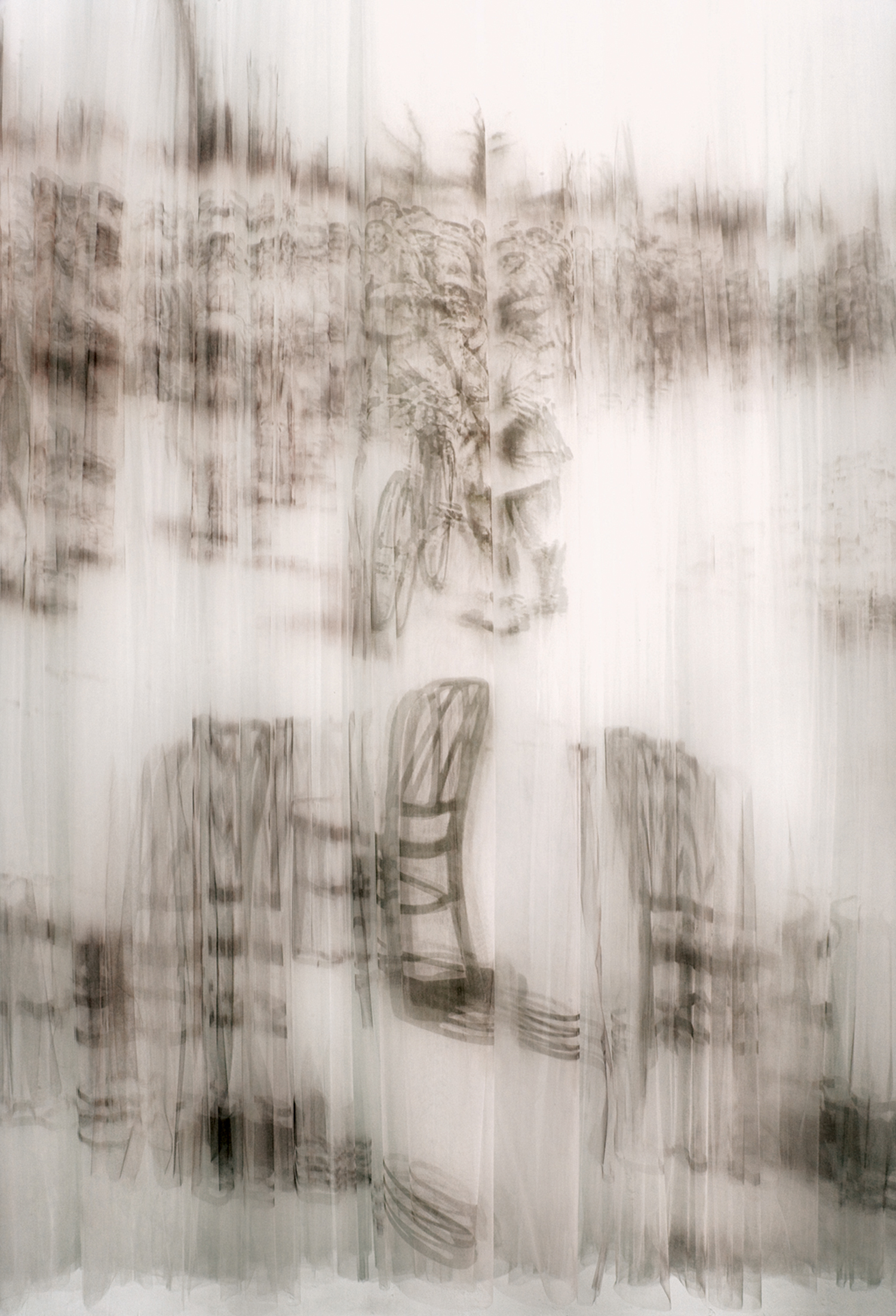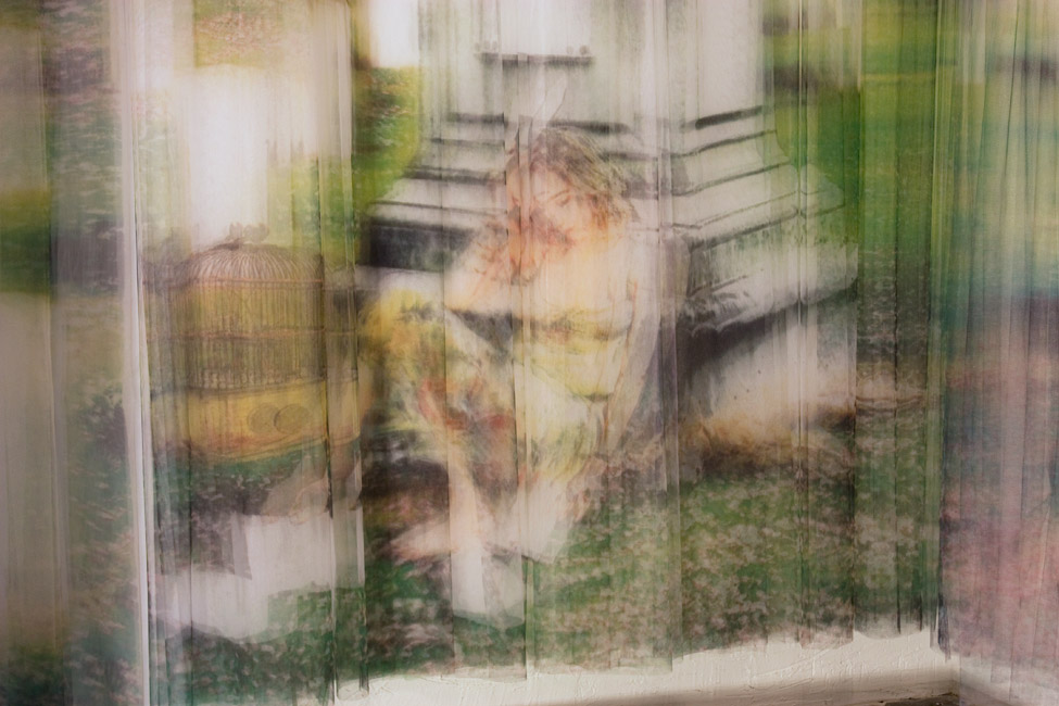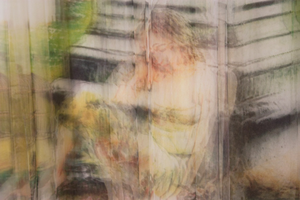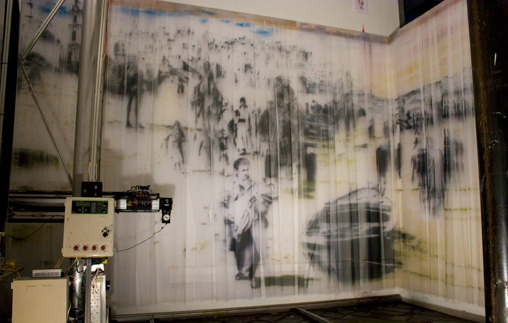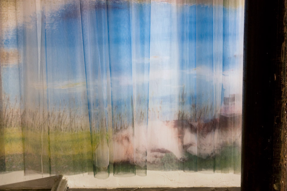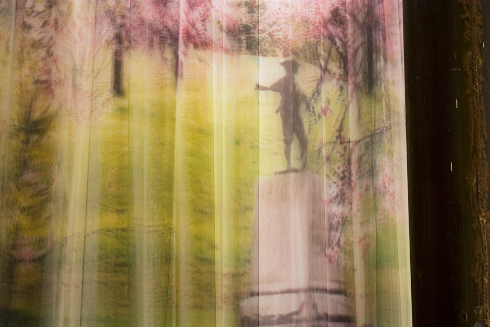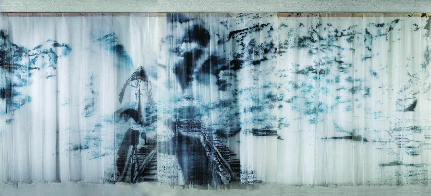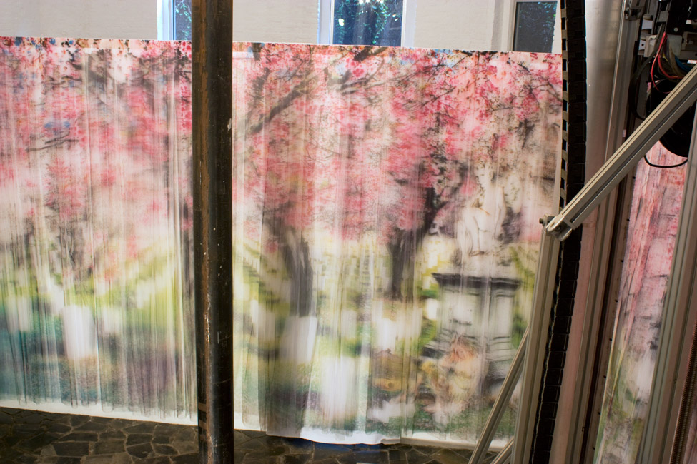 Rooms of wall size paintings in ink on pleated illusion (tulle curtains),