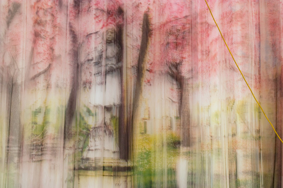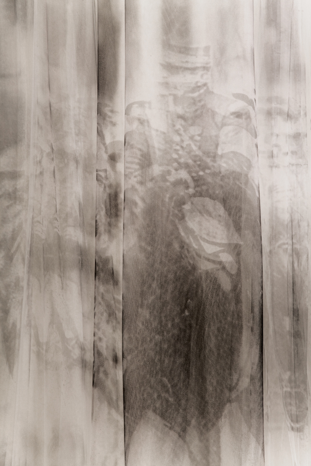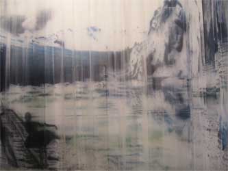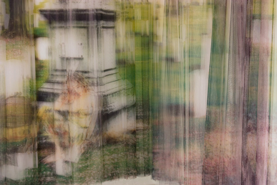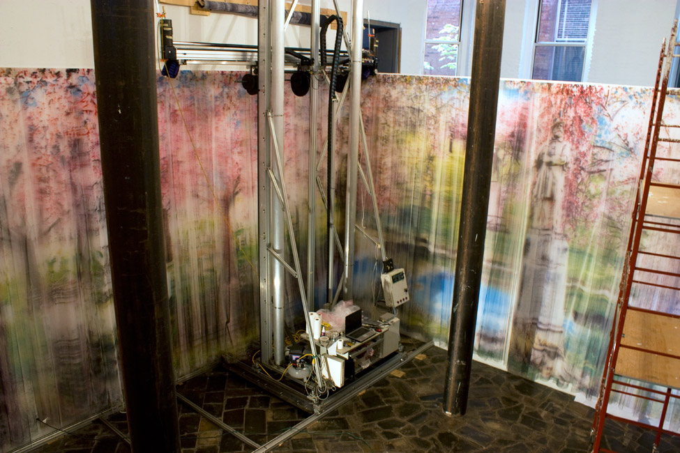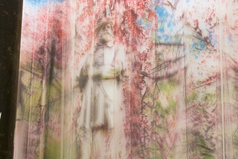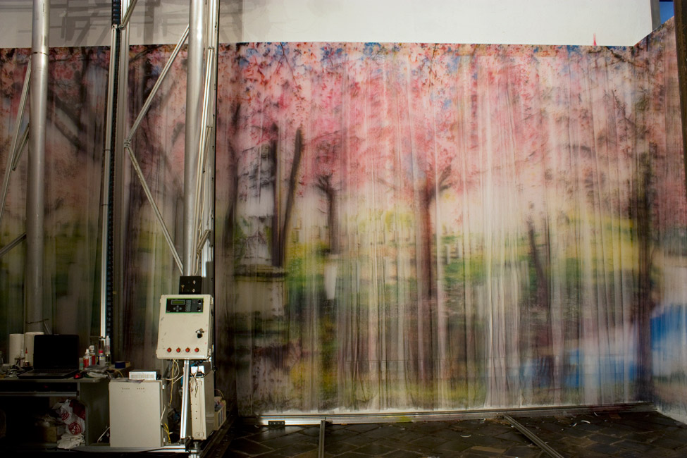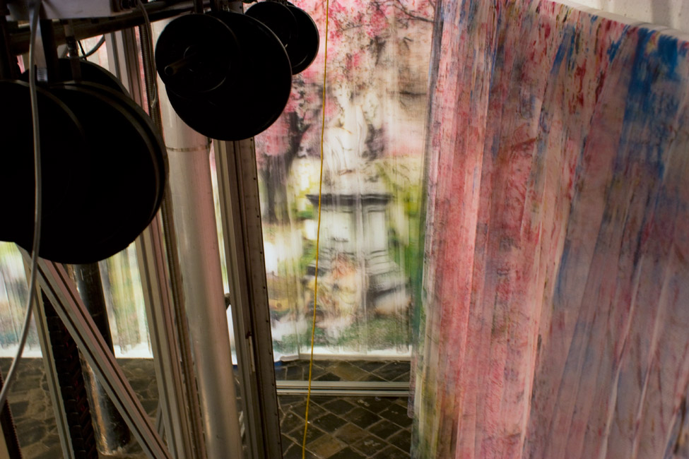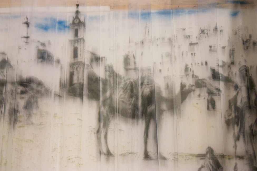 Rooms of wall size paintings in ink on pleated illusion (tulle curtains),